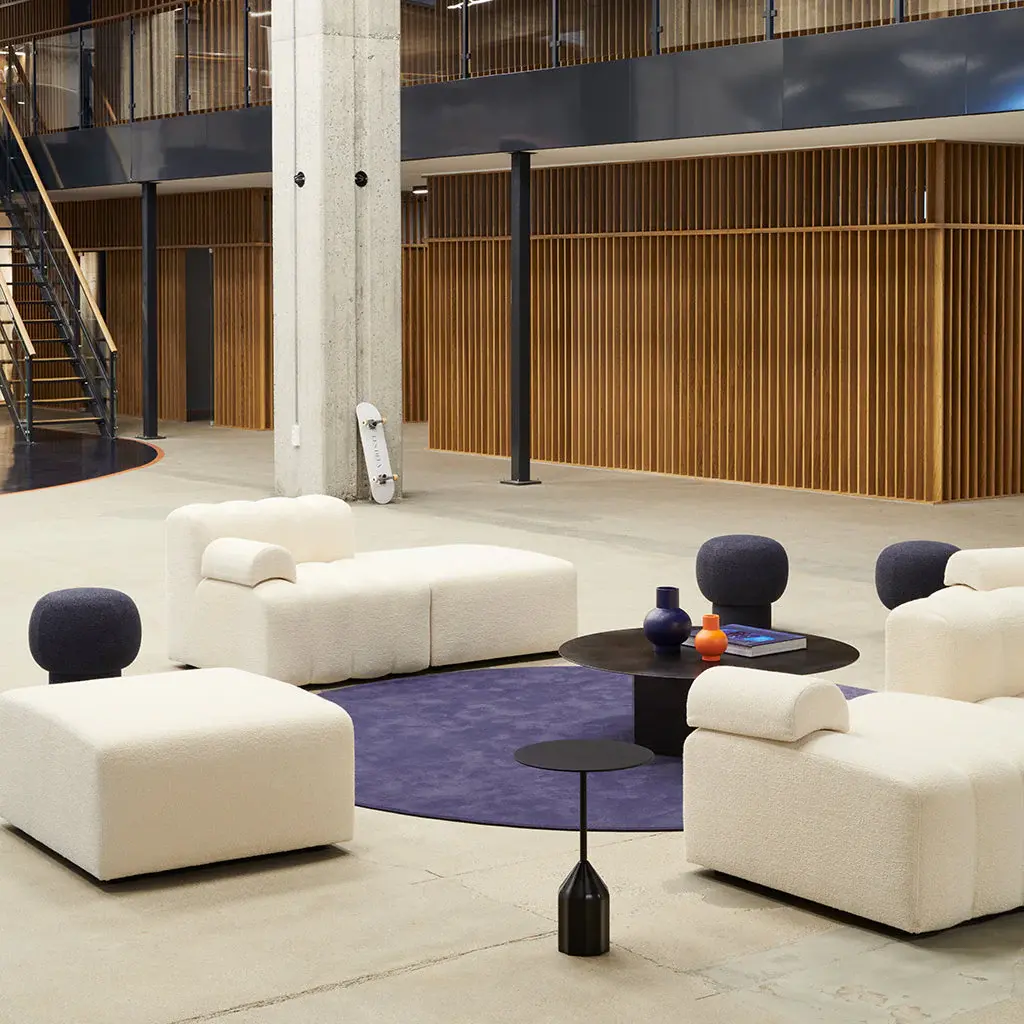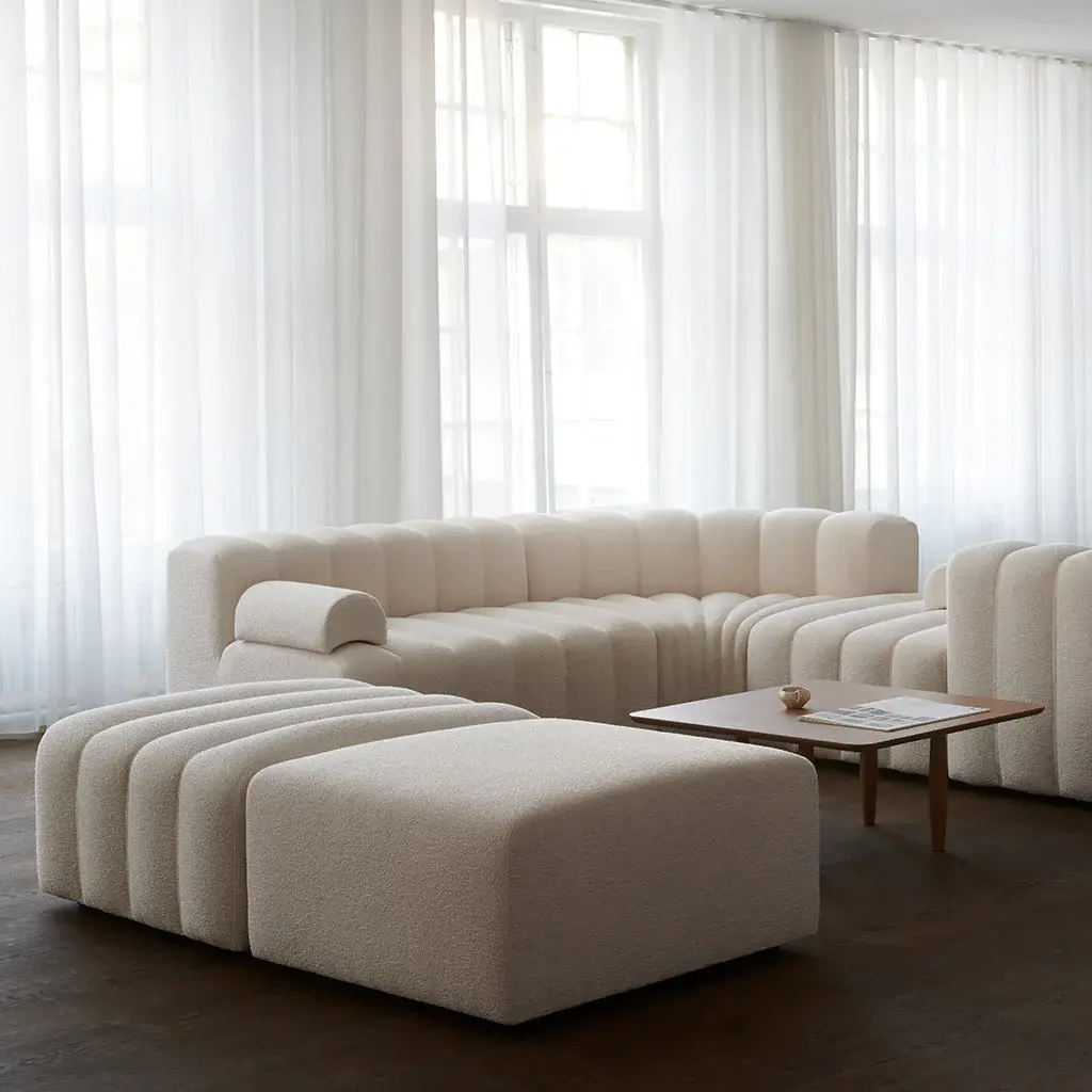 The Studio Ottoman is an accessory module that complements the Studio Sofa collection. Inspired by the bold aesthetics of the 1970s, the Studio Modular Sofa from Nor11 is characterized by its fluted upholstery and soft, inviting lines. The system includes multiple module variations that can be arranged to form different setups, whether for small living areas or larger social spaces. The loose armrest cushions are movable yet dense, boasting ample customization without sacrificing a comfortable and sturdy seat. Available in a wide range of high-quality fabrics and leather options.