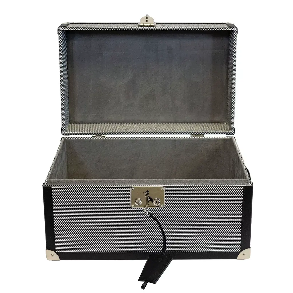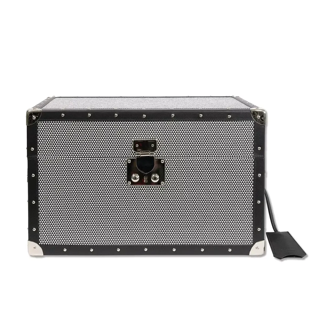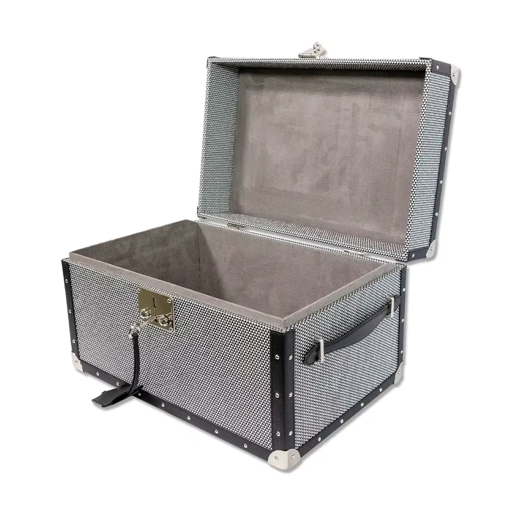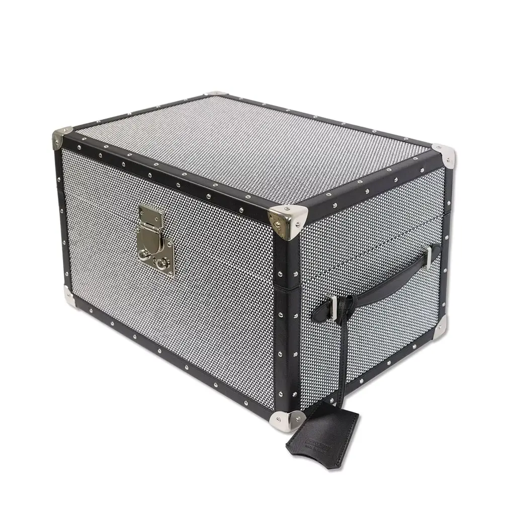 The wooden trunk is meticulously handcrafted, adorned with luxurious genuine leather that creates an optical effect, enhanced by sleek metal trunk details. Its interior is lined with soft microfiber for added protection. Available in an elegant optical black notte shade, along with a range of fourteen other colors, providing ample options for personalization to match diverse preferences. Please contact the Concierge for more information.