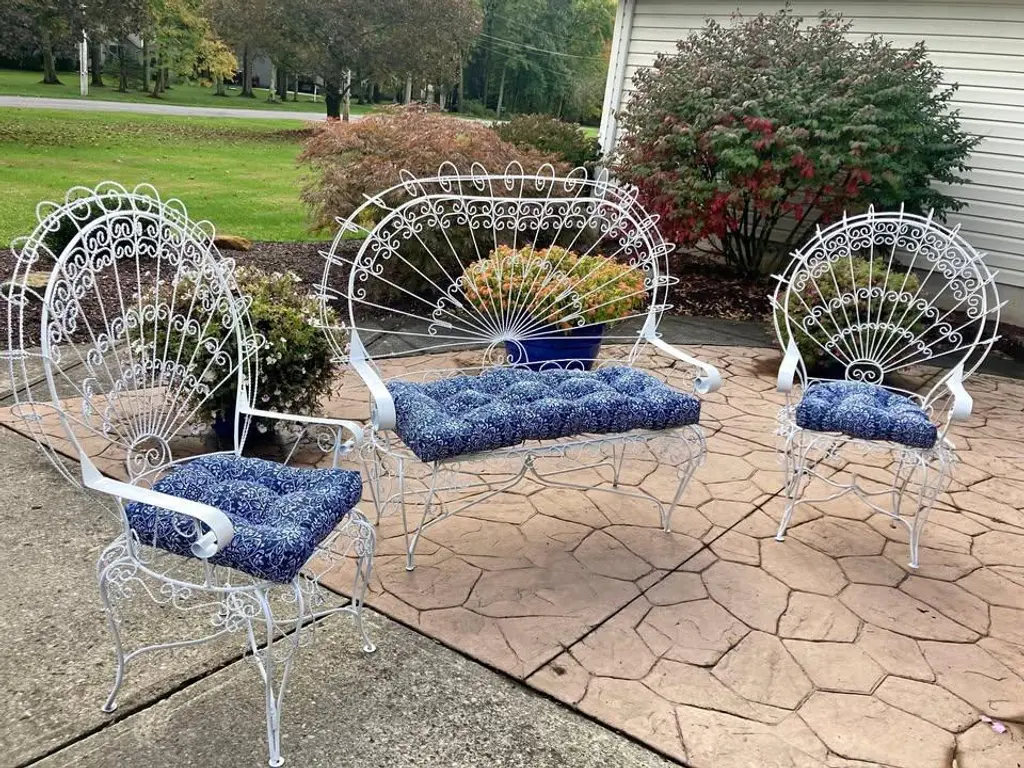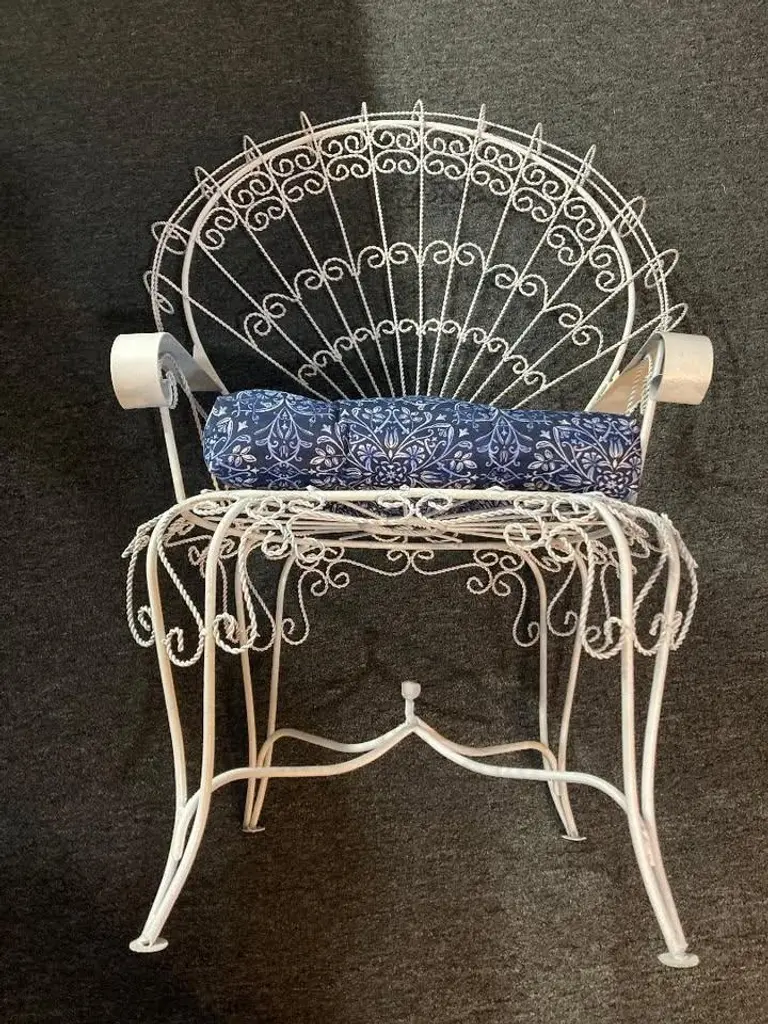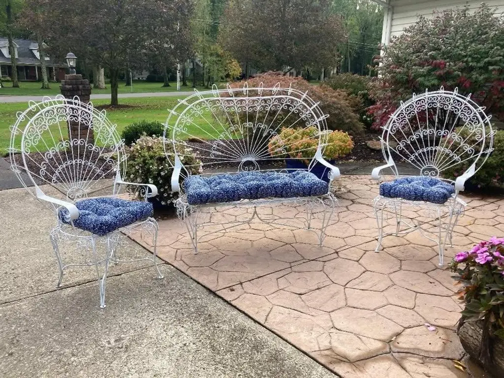 I have a Stunning Vintage Salterini Peacock Chair with Cushion. This chair is in excellent condition as you can see from the pictures. The paint is very good and the cushion has no rips. The chair measures approx. 36ʺW × 24ʺD × 50ʺH. I have a pair of these chairs along with the matching settee. Message me for a deal on more than one piece.