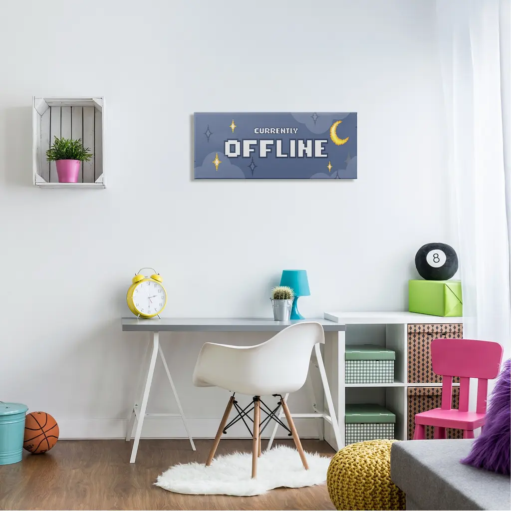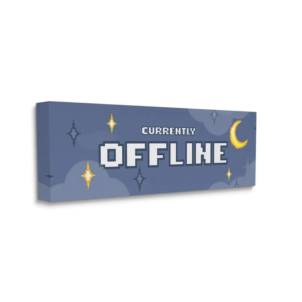 We create our stretched canvas to the highest standards. Using only the highest quality inks and canvas on Mimaki printers, we hand-cut and stretch each piece over a 1.5-inch thick wooden frame for hanging. As a result, the art comes ready to hang on the sturdy ledge with no installation required. Stupell Wall Art is made in the USA.Features: Dimensions: 24 x 1.5 x 10 InchesStretched Canvas Sizes Include Standard: 24 x 1.5 x 10 Large: 30 x 1.5 x 13 X-Large: 40 x 1.5 x 17 Oversized: 48 x 1.5 x 20Wall Art is Ready to Hang with Hardware Free Hanging. No installation required. For Easy Set Up Lean or Layer Artwork on Shelf or Against Wall.Our stretched canvas is created with the highest standards. We use only the highest quality inks and canvas on our in house Mimaki printers, and then hand cut and stretch each piece over a 1.5 inch thick wooden frame for hanging. Made In USA.Artwork Relates To: Gaming, Video Game, Gamer, Controller, Moon, Stars, Pixel, Currently OfflineDesign by Lil' Rue