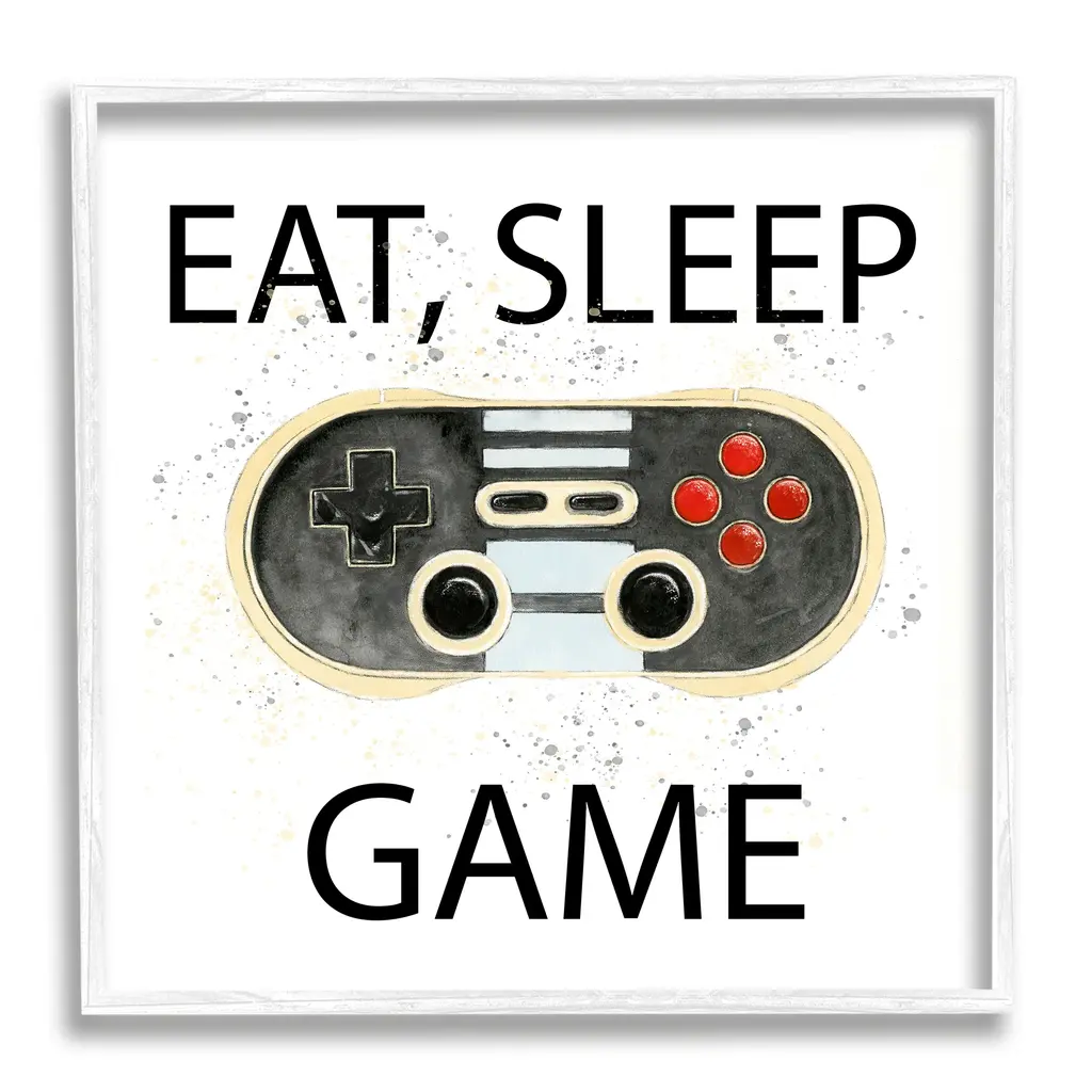 Add dimension to any room with our textured Framed Giclee Artwork. Our framed artwork is securely mounted into a 1.5-inch thick wood grain frame and ready to hang. Frames are available in three alluring styles: black, gray farmhouse and white. In addition, you should check out our oversized options if you want a statement piece. Stupell Wall Art is made in the USA.Features: Dimensions: 12 x 1.5 x 12 FramedFramed Giclee Sizes Include Standard: 12 x 1.5 x 12 Large: 17 x 1.5 x 17 Oversized: 24 x 1.5 x 24Wall Art is Ready to Hang - No Installation or Hardware Needed. For Easy Set Up Lean or Layer Artwork on Shelf or Against Wall.Our giclée prints are carefully mounted on a durable MDF backing, and then perfectly finished in a 1.5 inch thick woodgrain frame. Mounted frame colors include black, gray farmhouse and white. Made In USA.Artwork Relates To: Electronics, Joystick, Person, Video Gaming, Gaming, Video Game, Controller, Eat Sleep GameDesign by Annie Warren