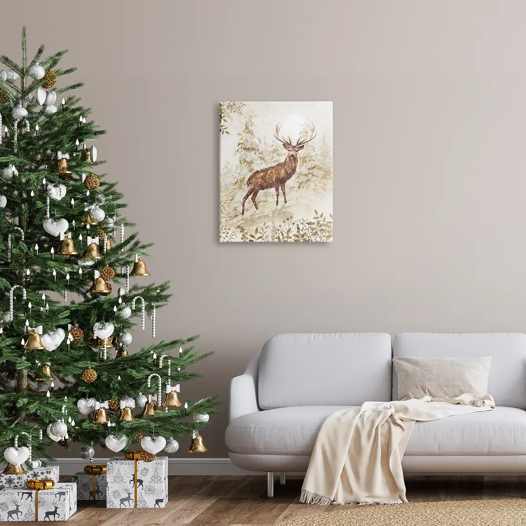 We create our stretched canvas to the highest standards. Using only the highest quality inks and canvas on Mimaki printers, we hand-cut and stretch each piece over a 1.5-inch thick wooden frame for hanging. As a result, the art comes ready to hang on the sturdy ledge with no installation required. Stupell Wall Art is made in the USA.Features: Dimensions: 16 x 1.5 x 20 InchesStretched Canvas Sizes Include Standard: 16 x 1.5 x 20 Large: 20 x 1.5 x 30 X-Large: 30 x 1.5 x 40 Oversized: 36 x 1.5 x 48Wall Art is Ready to Hang - No Installation or Hardware Needed. For Easy Set Up Lean or Layer Artwork on Shelf or Against Wall.Our stretched canvas is created with the highest standards. We use only the highest quality inks and canvas on our in house Mimaki printers, and then hand cut and stretch each piece over a 1.5 inch thick wooden frame for hanging. Made In USA.Artwork Relates To: Animal, Deer, Mammal, Wildlife, Elk, Snow, WinterDesign by Pip Wilson