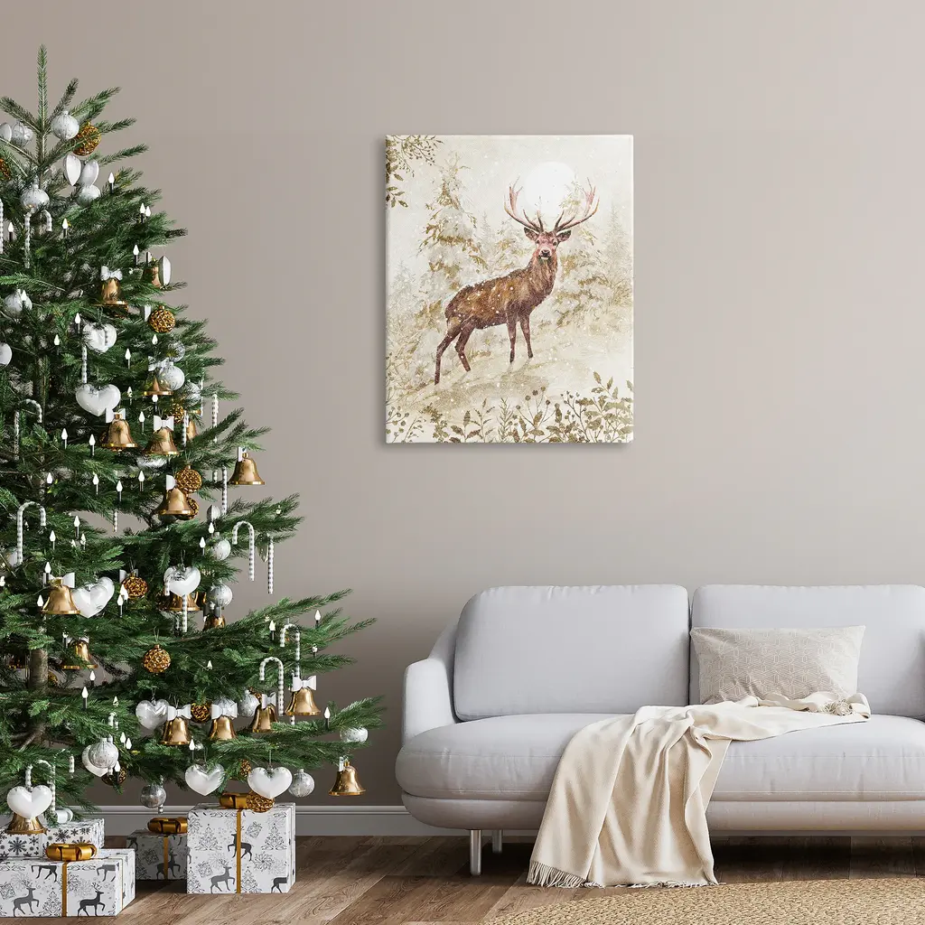 We create our stretched canvas to the highest standards. Using only the highest quality inks and canvas on Mimaki printers, we hand-cut and stretch each piece over a 1.5-inch thick wooden frame for hanging. As a result, the art comes ready to hang on the sturdy ledge with no installation required. Stupell Wall Art is made in the USA.Features: Dimensions: 16 x 1.5 x 20 InchesStretched Canvas Sizes Include Standard: 16 x 1.5 x 20 Large: 20 x 1.5 x 30 X-Large: 30 x 1.5 x 40 Oversized: 36 x 1.5 x 48Wall Art is Ready to Hang - No Installation or Hardware Needed. For Easy Set Up Lean or Layer Artwork on Shelf or Against Wall.Our stretched canvas is created with the highest standards. We use only the highest quality inks and canvas on our in house Mimaki printers, and then hand cut and stretch each piece over a 1.5 inch thick wooden frame for hanging. Made In USA.Artwork Relates To: Animal, Deer, Mammal, Wildlife, Elk, Snow, WinterDesign by Pip Wilson