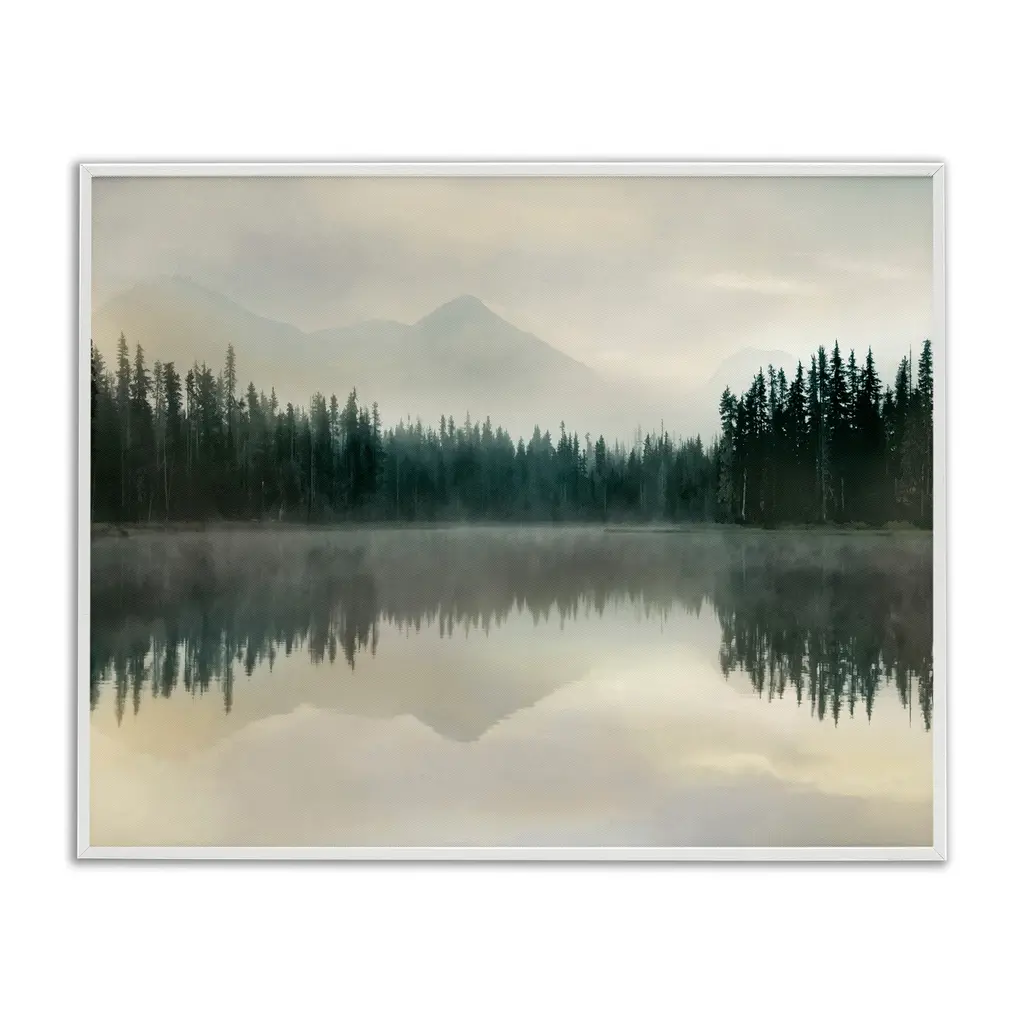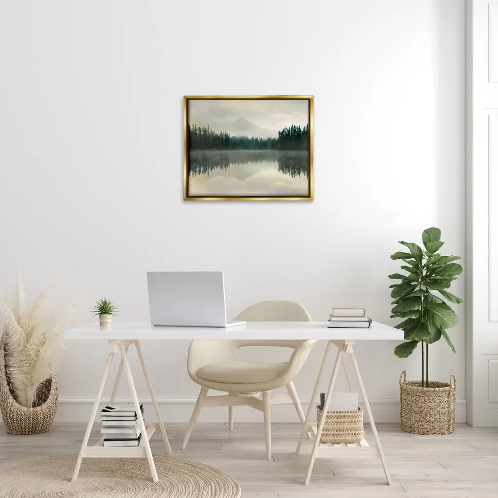 Stupell Foggy Lake Forest Landscape Soft Nature Water Reflection Floater Frame - Green - 31 X 25 - Gold