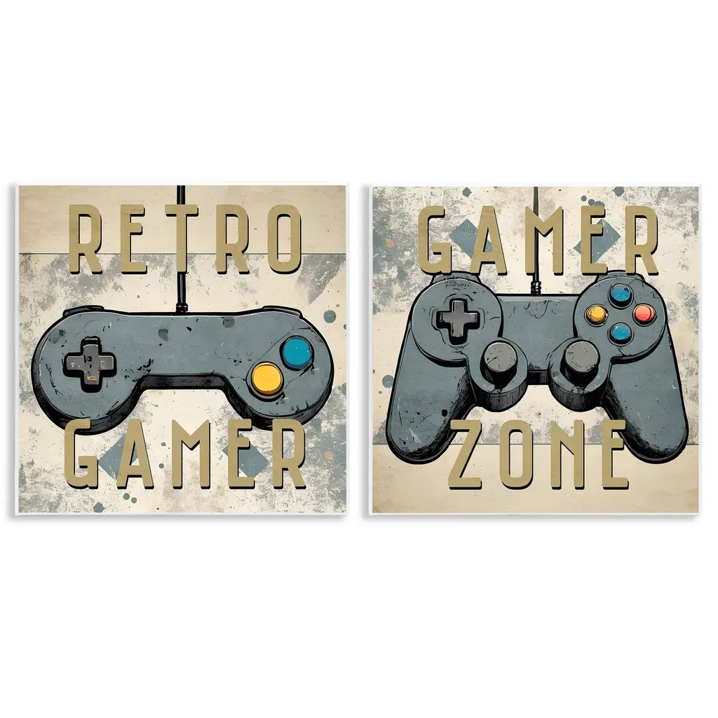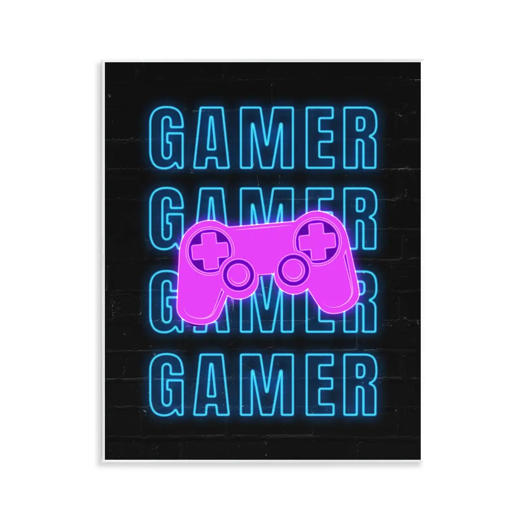Our wall plaques start as high-quality lithograph prints mounted on durable 0.5-inch thick MDF wood. Each piece is hand finished and comes with a fresh layer of white foil on the sides to give it a crisp, clean look. Plaques arrive ready to hang without installation and come with removable plastic corners to keep them from damage in transit. Stupell Wall Art is made in the USA.Features: Dimensions: 10 x 0.5 x 15 InchesWall Plaque Product Sizes Include 10"x15" and 13"x19". All wall plaque products have a 0.5" Depth. Wall Art is Ready to Hang with Hardware Free Hanging. No installation required. For Easy Set Up Lean or Layer Artwork on Shelf or Against Wall.All of our wall plaques start off as high quality lithograph prints that are then mounted on durable 0.5 inch thick MDF wood. Each piece is hand finished and comes with a fresh layer of foil on the sides to give it a crisp clean look. Made In USA.Artwork Relates To: Gamer, Gaming, Video Game, ControllerDesign by Kim Allen