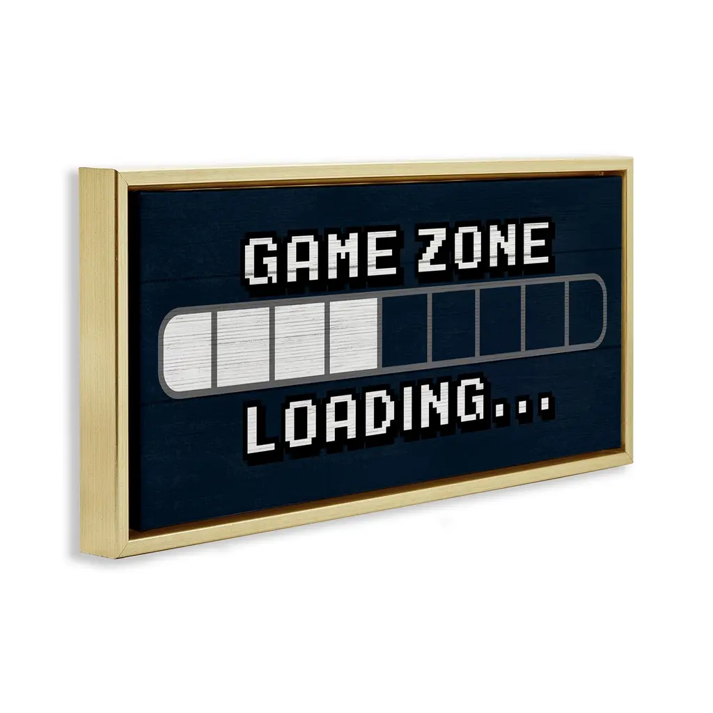 Elevate your home or office to the next level with Stupell Framed Floating Canvas Wall Art. Our premium hand-stretched canvas is mounted securely into a sturdy lightweight frame. The museum-style gap between the wrapped canvas and the box frame gives the illusion of floating artwork. Stupell Wall Art is made in the USA.Features: Dimensions: 25 x 1.7 x 11 Frame, 24 x 1.5 x 10 Canvas ArtFloating Frame Canvas Products are available in sizes 25"x11" and 31"x14". All Floating Frame Canvas Products have a 1.7" Depth.Wall Art is Ready to Hang with Hardware Free Hanging. No Installation required. For Easy Set Up Lean or Layer Artwork on Shelf or Against Wall. Artwork is Permently Fixed into the Frame.Our elevated 1.7" Thick Floating Frame is the perfect complement to our canvas style Wall Art. We use only the highest quality inks in house with industry leading printing solutions. Canvas is hand stretched over a durable wood foundation and then mounted securly into a Modern Box Frame. Made in the USA.Artwork Relates To: Loading, Gaming, Gamer, Video Game, Symbol, VintageDesign by Lil' Rue