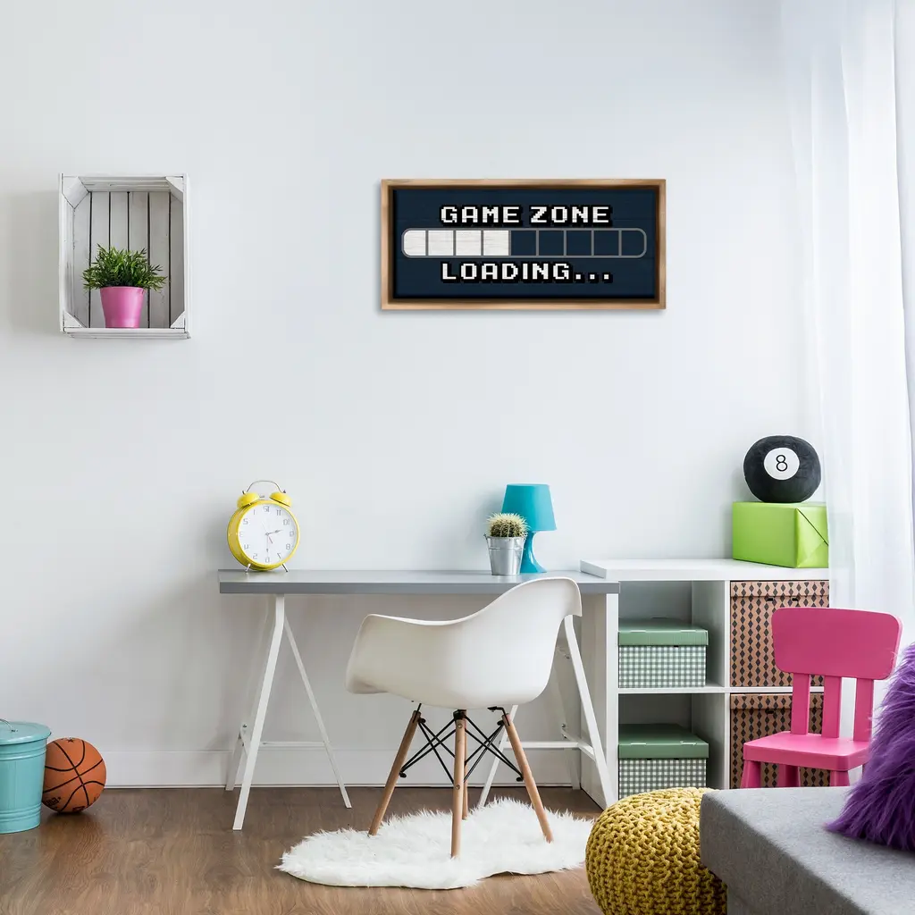 Elevate your home or office to the next level with Stupell Framed Floating Canvas Wall Art. Our premium hand-stretched canvas is mounted securely into a sturdy lightweight frame. The museum-style gap between the wrapped canvas and the box frame gives the illusion of floating artwork. Stupell Wall Art is made in the USA.Features: Dimensions: 25 x 1.7 x 11 Frame, 24 x 1.5 x 10 Canvas ArtFloating Frame Canvas Products are available in sizes 25"x11" and 31"x14". All Floating Frame Canvas Products have a 1.7" Depth.Wall Art is Ready to Hang with Hardware Free Hanging. No Installation required. For Easy Set Up Lean or Layer Artwork on Shelf or Against Wall. Artwork is Permently Fixed into the Frame.Our elevated 1.7" Thick Floating Frame is the perfect complement to our canvas style Wall Art. We use only the highest quality inks in house with industry leading printing solutions. Canvas is hand stretched over a durable wood foundation and then mounted securly into a Modern Box Frame. Made in the USA.Artwork Relates To: Loading, Gaming, Gamer, Video Game, Symbol, VintageDesign by Lil' Rue