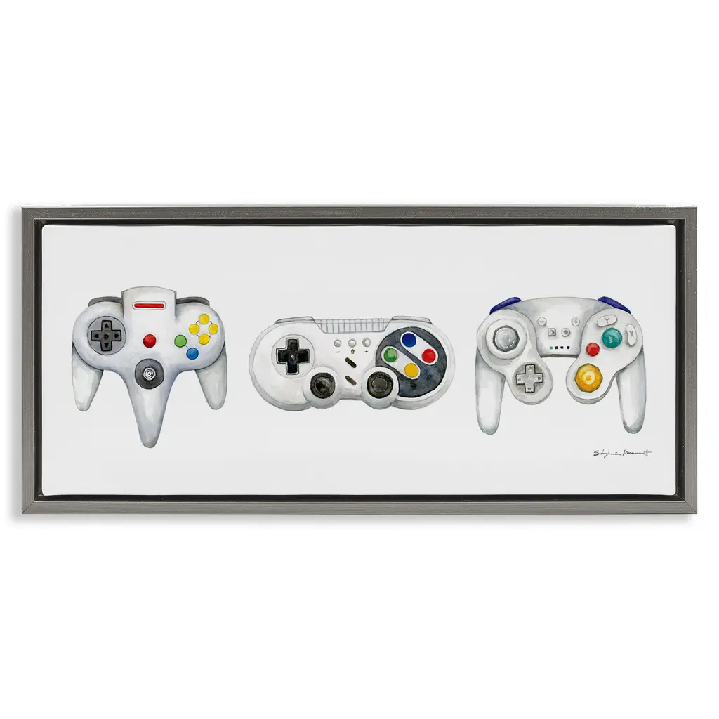 Elevate your home or office to the next level with Stupell Framed Floating Canvas Wall Art. Our premium hand-stretched canvas is mounted securely into a sturdy lightweight frame. The museum-style gap between the wrapped canvas and the box frame gives the illusion of floating artwork. Stupell Wall Art is made in the USA.Features: Dimensions: 17 x 1.7 x 21 Frame, 16 x 1.5 x 20 Canvas ArtFloating Frame Sizes Include Standard: 17 x 1.7 x 21 Oversized: 25 x 1.7 x 31Wall Art is Ready to Hang - No Installation or Hardware Needed. For Easy Set Up Lean or Layer Artwork on Shelf or Against Wall.Our elevated 1.7" Thick Floating Frame is the perfect complement to our canvas style Wall Art. We use only the highest quality inks in house with industry leading printing solutions. Canvas is hand stretched over a durable wood foundation and then mounted securly into a Modern Box Frame. Made in the USA.Artwork Relates To: Electronics, Joystick, Person, Video Gaming, Gaming, Video Game, Controller, Hardcore GamerDesign by Grace Popp