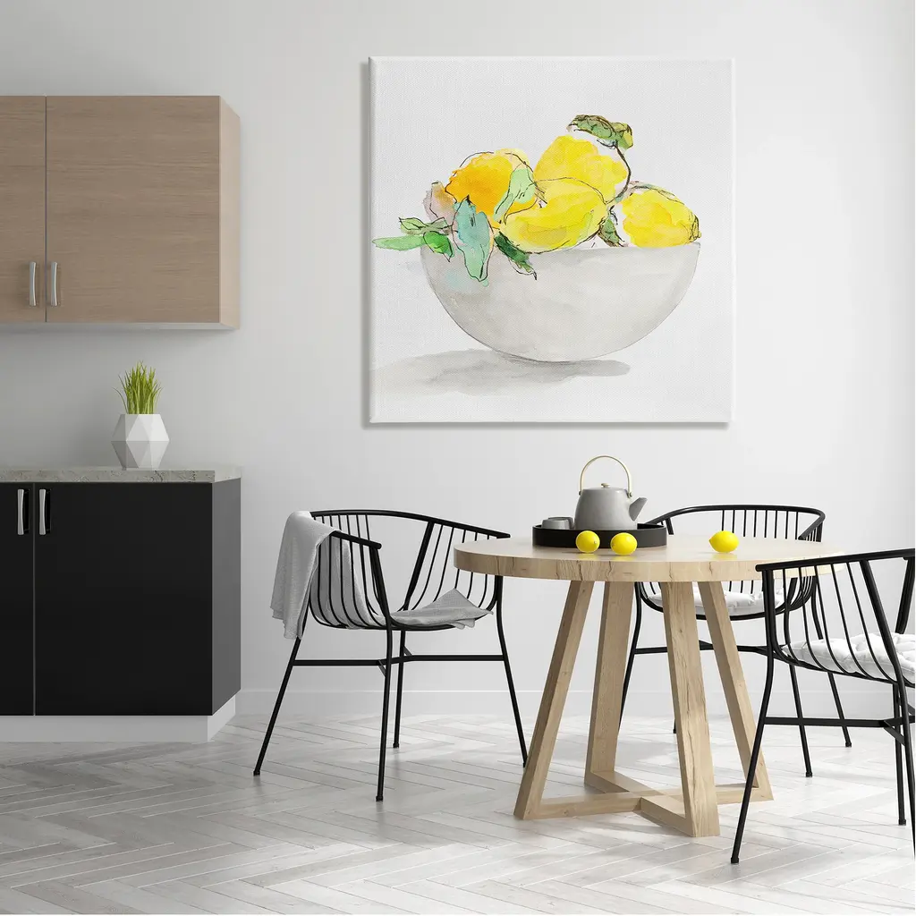 We create our stretched canvas to the highest standards. Using only the highest quality inks and canvas on Mimaki printers, we hand-cut and stretch each piece over a 1.5-inch thick wooden frame for hanging. As a result, the art comes ready to hang on the sturdy ledge with no installation required. Stupell Wall Art is made in the USA.Features: Dimensions: 17 x 1.5 x 17 InchesStretched Canvas Sizes Include Standard: 17 x 1.5 x 17 Large: 24 x 1.5 x 24 X-Large: 30 x 1.5 x 30 Oversized: 36 x 1.5 x 36Wall Art is Ready to Hang with Hardware Free Hanging. No installation required. For Easy Set Up Lean or Layer Artwork on Shelf or Against Wall.Our stretched canvas is created with the highest standards. We use only the highest quality inks and canvas on our in house Mimaki printers, and then hand cut and stretch each piece over a 1.5 inch thick wooden frame for hanging. Made In USA.Artwork Relates To: Painting, Flower, Food, Fruit, Produce, Bowl, Lemon, CitrusDesign by Lanie Loreth