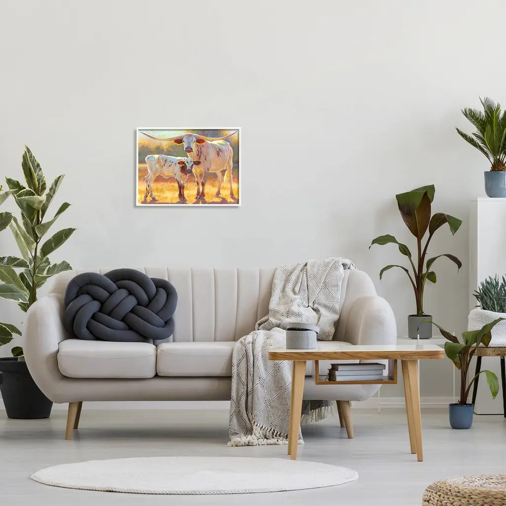 Stupell Longhorn & Calf Standing Farm Field Framed Giclee Art By Rita Kirkman - 20 X 16 - White
