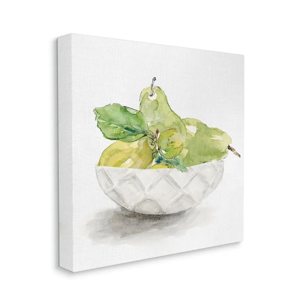 We create our stretched canvas to the highest standards. Using only the highest quality inks and canvas on Mimaki printers, we hand-cut and stretch each piece over a 1.5-inch thick wooden frame for hanging. As a result, the art comes ready to hang on the sturdy ledge with no installation required. Stupell Wall Art is made in the USA.Features: Dimensions: 17 x 1.5 x 17 InchesStretched Canvas Sizes Include Standard: 17 x 1.5 x 17 Large: 24 x 1.5 x 24 X-Large: 30 x 1.5 x 30 Oversized: 36 x 1.5 x 36Wall Art is Ready to Hang with Hardware Free Hanging. No installation required. For Easy Set Up Lean or Layer Artwork on Shelf or Against Wall.Our stretched canvas is created with the highest standards. We use only the highest quality inks and canvas on our in house Mimaki printers, and then hand cut and stretch each piece over a 1.5 inch thick wooden frame for hanging. Made In USA.Artwork Relates To: Painting, Flower, Food, Fruit, Produce, Bowl, PearDesign by Lanie Loreth