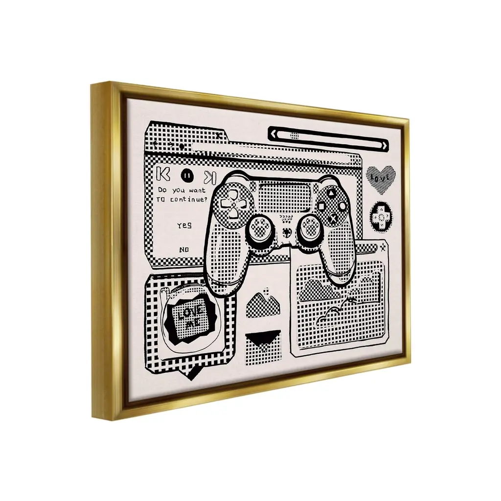 Elevate your home or office to the next level with Stupell Framed Floating Canvas Wall Art. Our premium hand-stretched canvas is mounted securely into a sturdy lightweight frame. The museum-style gap between the wrapped canvas and the box frame gives the illusion of floating artwork. Stupell Wall Art is made in the USA.Features: Dimensions: 21 x 1.7 x 17 Frame, 20 x 1.5 x 16 Canvas ArtFloating Frame Canvas Products are available in sizes 21"x17" and 31"x25". All Floating Frame Canvas Products have a 1.7" Depth.Wall Art is Ready to Hang with Hardware Free Hanging. No Installation required. For Easy Set Up Lean or Layer Artwork on Shelf or Against Wall. Artwork is Permently Fixed into the Frame.Our elevated 1.7" Thick Floating Frame is the perfect complement to our canvas style Wall Art. We use only the highest quality inks in house with industry leading printing solutions. Canvas is hand stretched over a durable wood foundation and then mounted securly into a Modern Box Frame. Made in the USA.Artwork Relates To: Video Games, Gaming, Gamer, Pattern, Retro, Abstract, Vintage, Controller, EmailDesign by Melissa Wang