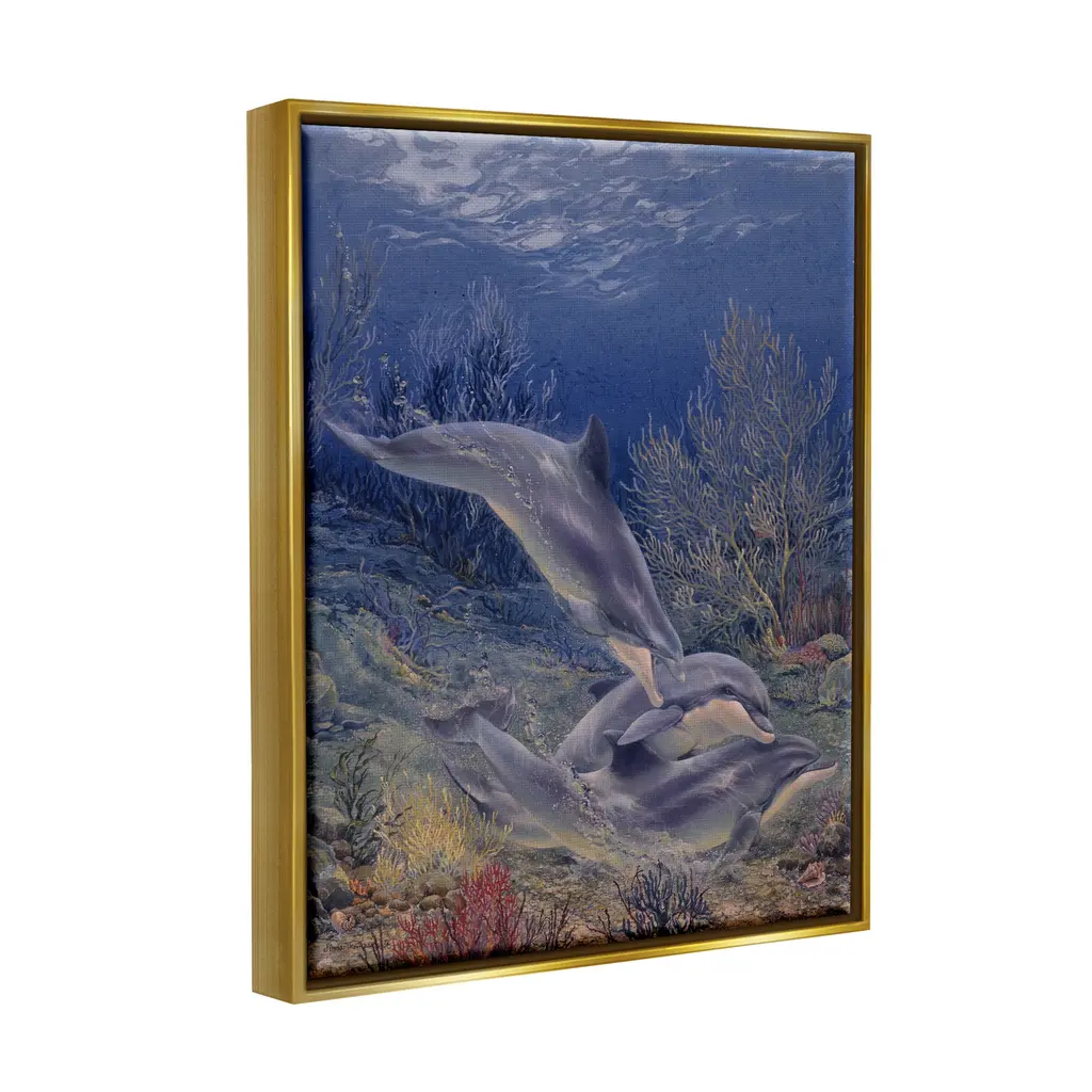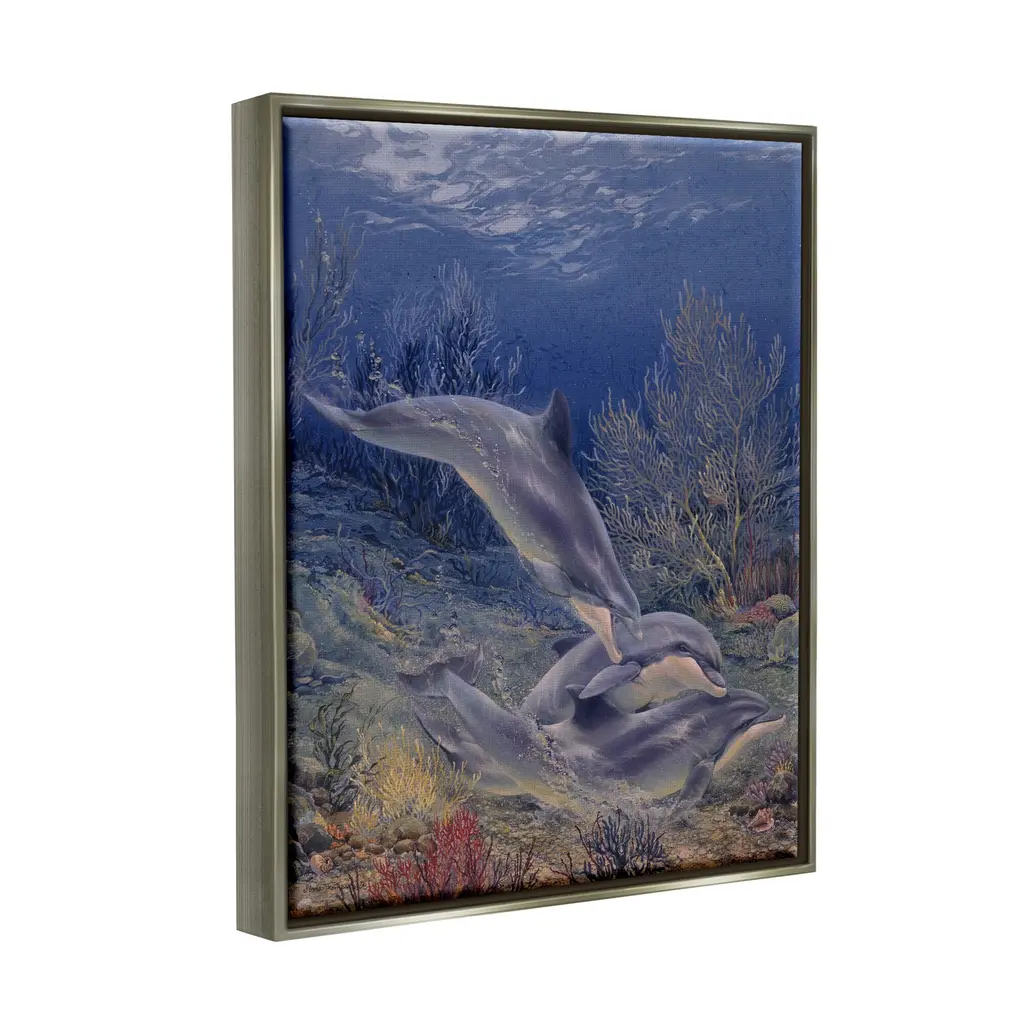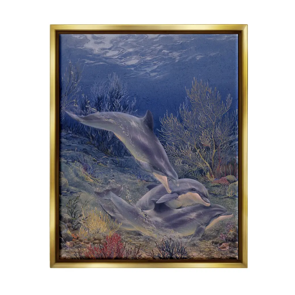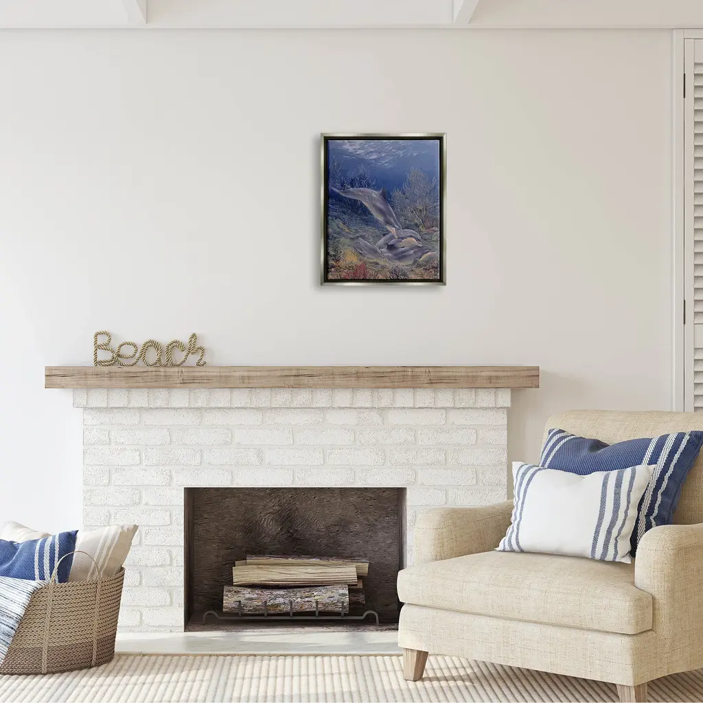 Elevate your home or office to the next level with Stupell Framed Floating Canvas Wall Art. Our premium hand-stretched canvas is mounted securely into a sturdy lightweight frame. The museum-style gap between the wrapped canvas and the box frame gives the illusion of floating artwork. Stupell Wall Art is made in the USA.Features: Dimensions: 17 x 1.7 x 21 Frame, 16 x 1.5 x 20 Canvas ArtFloating Frame Sizes Include Standard: 17 x 1.7 x 21 Oversized: 25 x 1.7 x 31Wall Art is Ready to Hang - No Installation or Hardware Needed. For Easy Set Up Lean or Layer Artwork on Shelf or Against Wall.Our elevated 1.7" Thick Floating Frame is the perfect complement to our canvas style Wall Art. We use only the highest quality inks in house with industry leading printing solutions. Canvas is hand stretched over a durable wood foundation and then mounted securly into a Modern Box Frame. Made in the USA.Artwork Relates To: Animal, Dolphin, Mammal, Sea Life, Fish, Water, Nature, Sea, Aquatic, ReefDesign by Linda Thompson