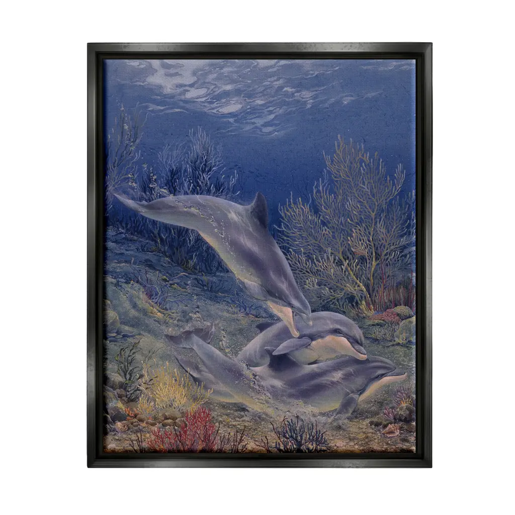 Elevate your home or office to the next level with Stupell Framed Floating Canvas Wall Art. Our premium hand-stretched canvas is mounted securely into a sturdy lightweight frame. The museum-style gap between the wrapped canvas and the box frame gives the illusion of floating artwork. Stupell Wall Art is made in the USA.Features: Dimensions: 17 x 1.7 x 21 Frame, 16 x 1.5 x 20 Canvas ArtFloating Frame Sizes Include Standard: 17 x 1.7 x 21 Oversized: 25 x 1.7 x 31Wall Art is Ready to Hang - No Installation or Hardware Needed. For Easy Set Up Lean or Layer Artwork on Shelf or Against Wall.Our elevated 1.7" Thick Floating Frame is the perfect complement to our canvas style Wall Art. We use only the highest quality inks in house with industry leading printing solutions. Canvas is hand stretched over a durable wood foundation and then mounted securly into a Modern Box Frame. Made in the USA.Artwork Relates To: Animal, Dolphin, Mammal, Sea Life, Fish, Water, Nature, Sea, Aquatic, ReefDesign by Linda Thompson