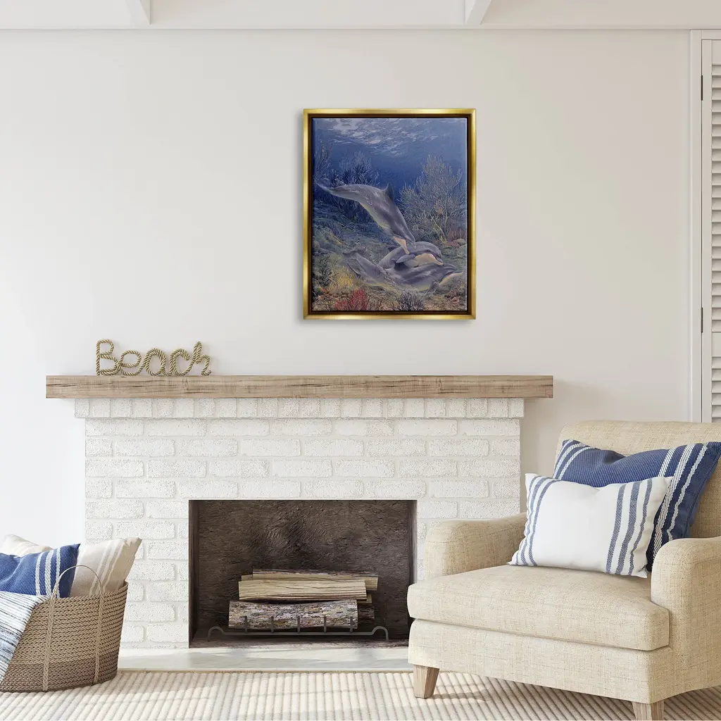 Stupell Shell Game Underwater Dolphins Framed Floater Canvas Wall Art By Linda Thompson - 24 X 30 - Gold
