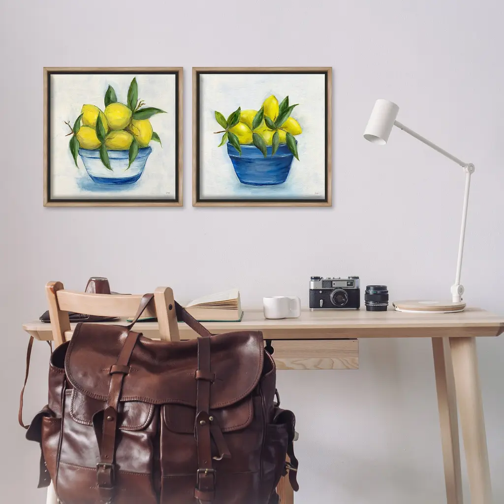 Elevate your home or office to the next level with Stupell Framed Floating Canvas Wall Art. Our premium hand-stretched canvas is mounted securely into a sturdy lightweight frame. The museum-style gap between the wrapped canvas and the box frame gives the illusion of floating artwork. Stupell Wall Art is made in the USA.Features: Dimensions: 2 Piece Set, Each Frame is 18 x 1.7 x 18Two Piece Floating Frame Canvas Products are available as 18"x18" or 25"x25" Panels. All Floating Frame Canvas Products have a 1.7" Depth.Wall Art is Ready to Hang with Hardware Free Hanging. No Installation required. For Easy Set Up Lean or Layer Artwork on Shelf or Against Wall. Artwork is Permently Fixed into the Frame.Our elevated 1.7" Thick Floating Frame is the perfect complement to our canvas style Wall Art. We use only the highest quality inks in house with industry leading printing solutions. Canvas is hand stretched over a durable wood foundation and then mounted securly into a Modern Box Frame. Made in the USA.Artwork Relates To: Citrus Fruit, Food, Fruit, Lemon, Plant, Country, TraditionalDesign by Marilyn Dunlap