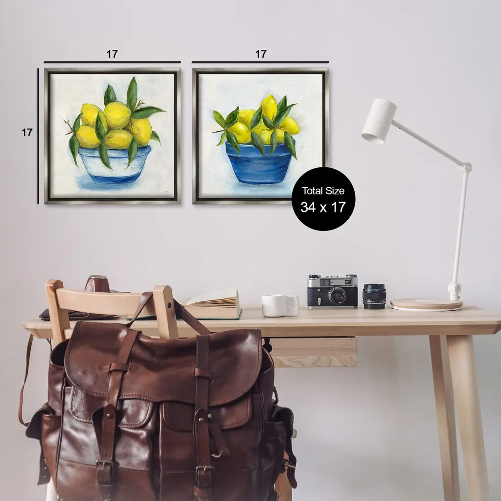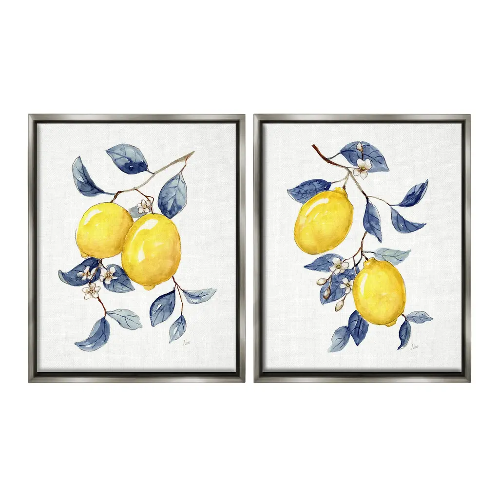 Elevate your home or office to the next level with Stupell Framed Floating Canvas Wall Art. Our premium hand-stretched canvas is mounted securely into a sturdy lightweight frame. The museum-style gap between the wrapped canvas and the box frame gives the illusion of floating artwork. Stupell Wall Art is made in the USA.Features: Dimensions: 2 Piece Set, Each Frame is 18 x 1.7 x 18Two Piece Floating Frame Canvas Products are available as 18"x18" or 25"x25" Panels. All Floating Frame Canvas Products have a 1.7" Depth.Wall Art is Ready to Hang with Hardware Free Hanging. No Installation required. For Easy Set Up Lean or Layer Artwork on Shelf or Against Wall. Artwork is Permently Fixed into the Frame.Our elevated 1.7" Thick Floating Frame is the perfect complement to our canvas style Wall Art. We use only the highest quality inks in house with industry leading printing solutions. Canvas is hand stretched over a durable wood foundation and then mounted securly into a Modern Box Frame. Made in the USA.Artwork Relates To: Citrus Fruit, Food, Fruit, Lemon, Plant, Country, TraditionalDesign by Marilyn Dunlap
