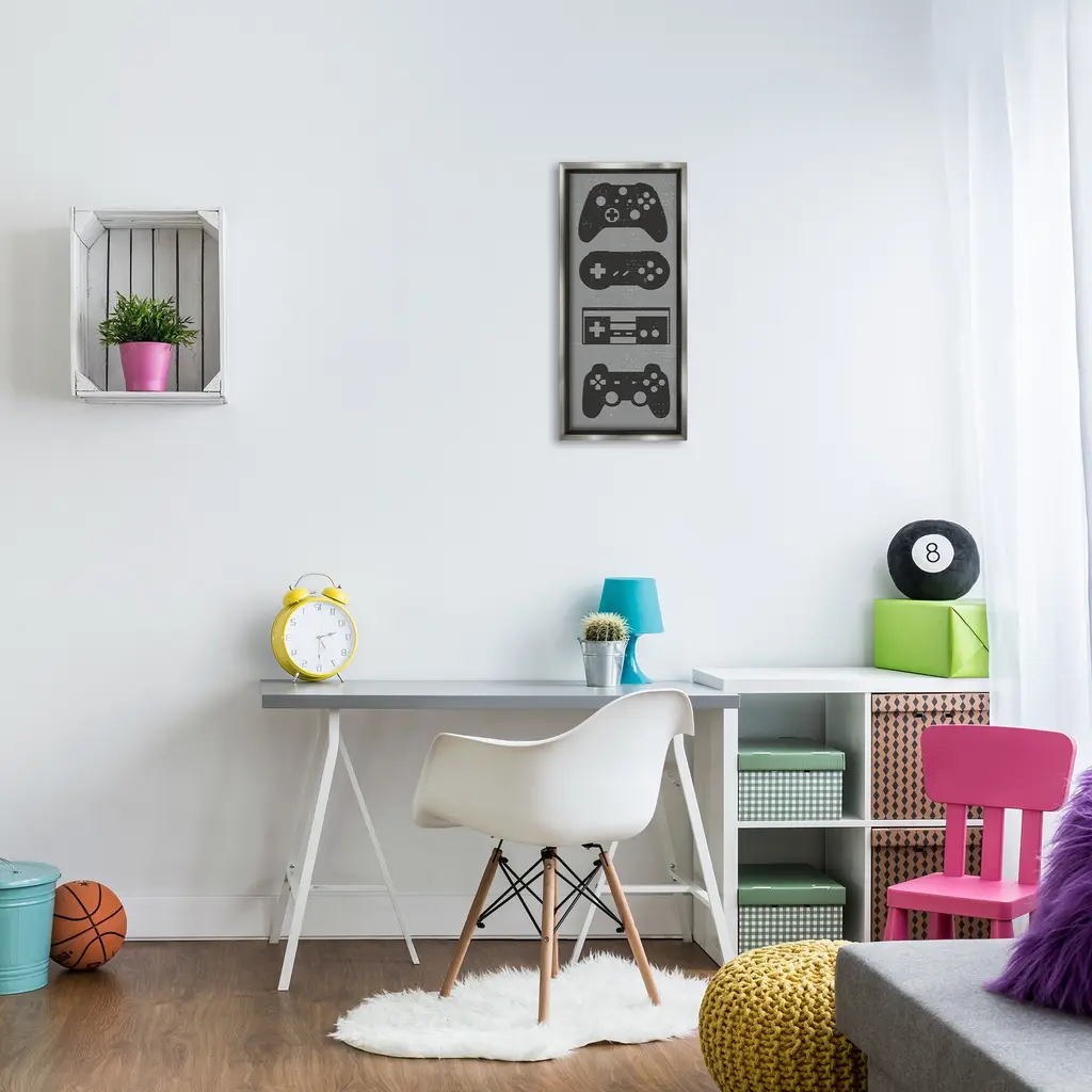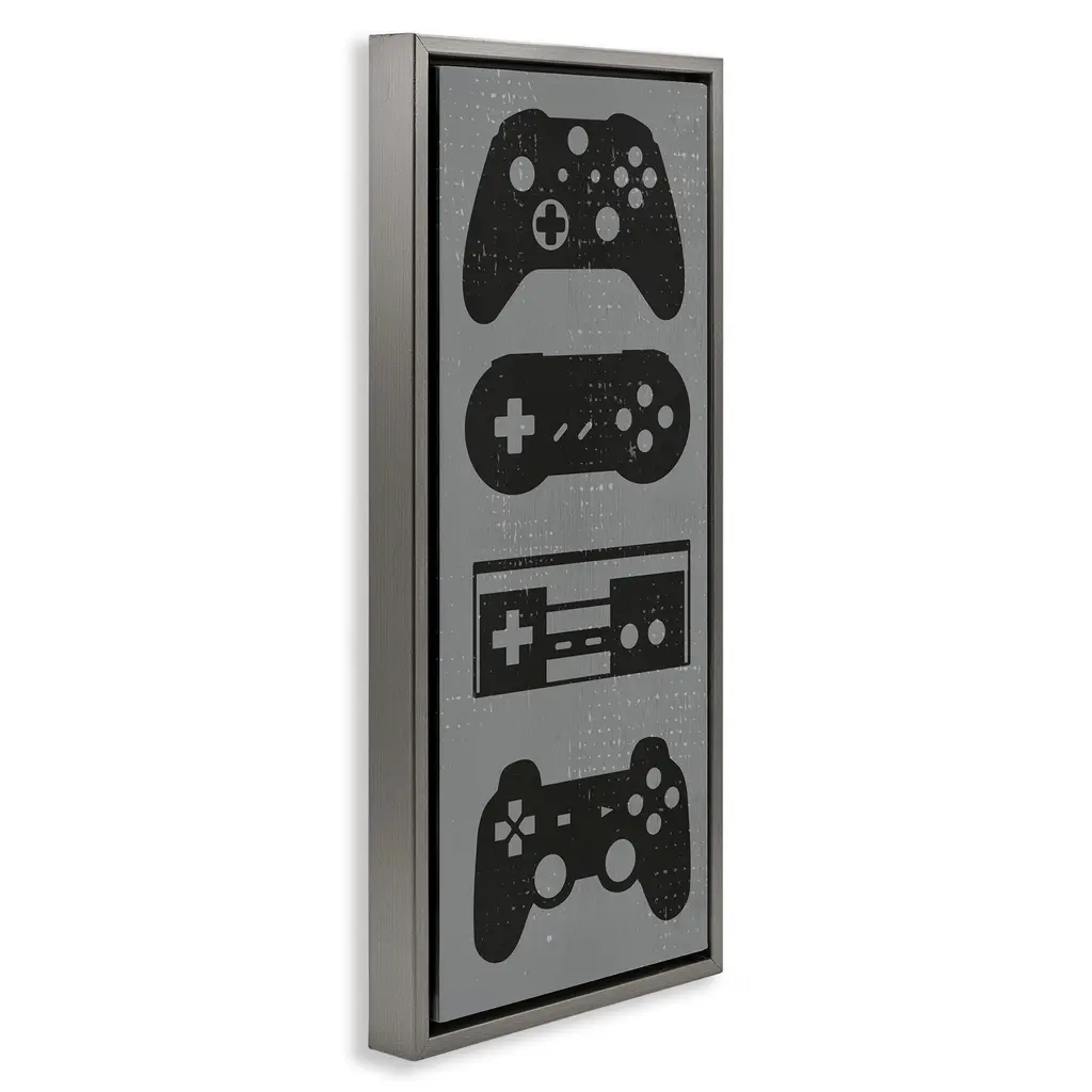 Elevate your home or office to the next level with Stupell Framed Floating Canvas Wall Art. Our premium hand-stretched canvas is mounted securely into a sturdy lightweight frame. The museum-style gap between the wrapped canvas and the box frame gives the illusion of floating artwork. Stupell Wall Art is made in the USA.Features: Dimensions: 11 x 1.7 x 25 Frame, 10 x 1.5 x 24 Canvas ArtFloating Frame Canvas Products are available in sizes 11"x25" and 14"x31". All Floating Frame Canvas Products have a 1.7" Depth.Wall Art is Ready to Hang with Hardware Free Hanging. No Installation required. For Easy Set Up Lean or Layer Artwork on Shelf or Against Wall. Artwork is Permently Fixed into the Frame.Our elevated 1.7" Thick Floating Frame is the perfect complement to our canvas style Wall Art. We use only the highest quality inks in house with industry leading printing solutions. Canvas is hand stretched over a durable wood foundation and then mounted securly into a Modern Box Frame. Made in the USA.Artwork Relates To: Video Games, Gaming, Gamer, Controller, Vintage, RusticDesign by Daphne Polselli