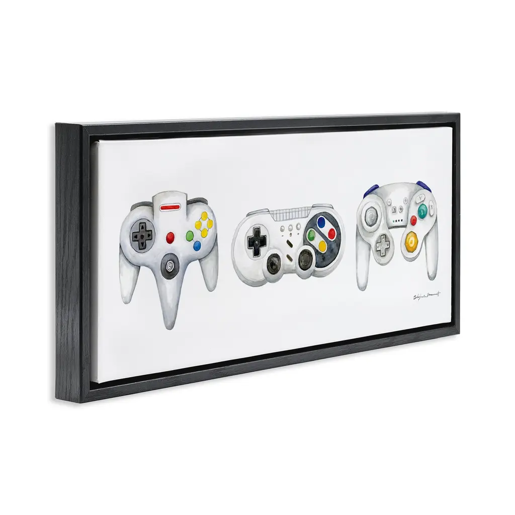 Elevate your home or office to the next level with Stupell Framed Floating Canvas Wall Art. Our premium hand-stretched canvas is mounted securely into a sturdy lightweight frame. The museum-style gap between the wrapped canvas and the box frame gives the illusion of floating artwork. Stupell Wall Art is made in the USA.Features: Dimensions: 25 x 1.7 x 11 Frame, 24 x 1.5 x 10 Canvas ArtFloating Frame Canvas Products are available in sizes 25"x11" and 31"x14". All Floating Frame Canvas Products have a 1.7" Depth.Wall Art is Ready to Hang with Hardware Free Hanging. No Installation required. For Easy Set Up Lean or Layer Artwork on Shelf or Against Wall. Artwork is Permently Fixed into the Frame.Our elevated 1.7" Thick Floating Frame is the perfect complement to our canvas style Wall Art. We use only the highest quality inks in house with industry leading printing solutions. Canvas is hand stretched over a durable wood foundation and then mounted securly into a Modern Box Frame. Made in the USA.Artwork Relates To: Electronics, Joystick, Controller, Video Games, Gaming, VintageDesign by Stephanie Workman Marrott