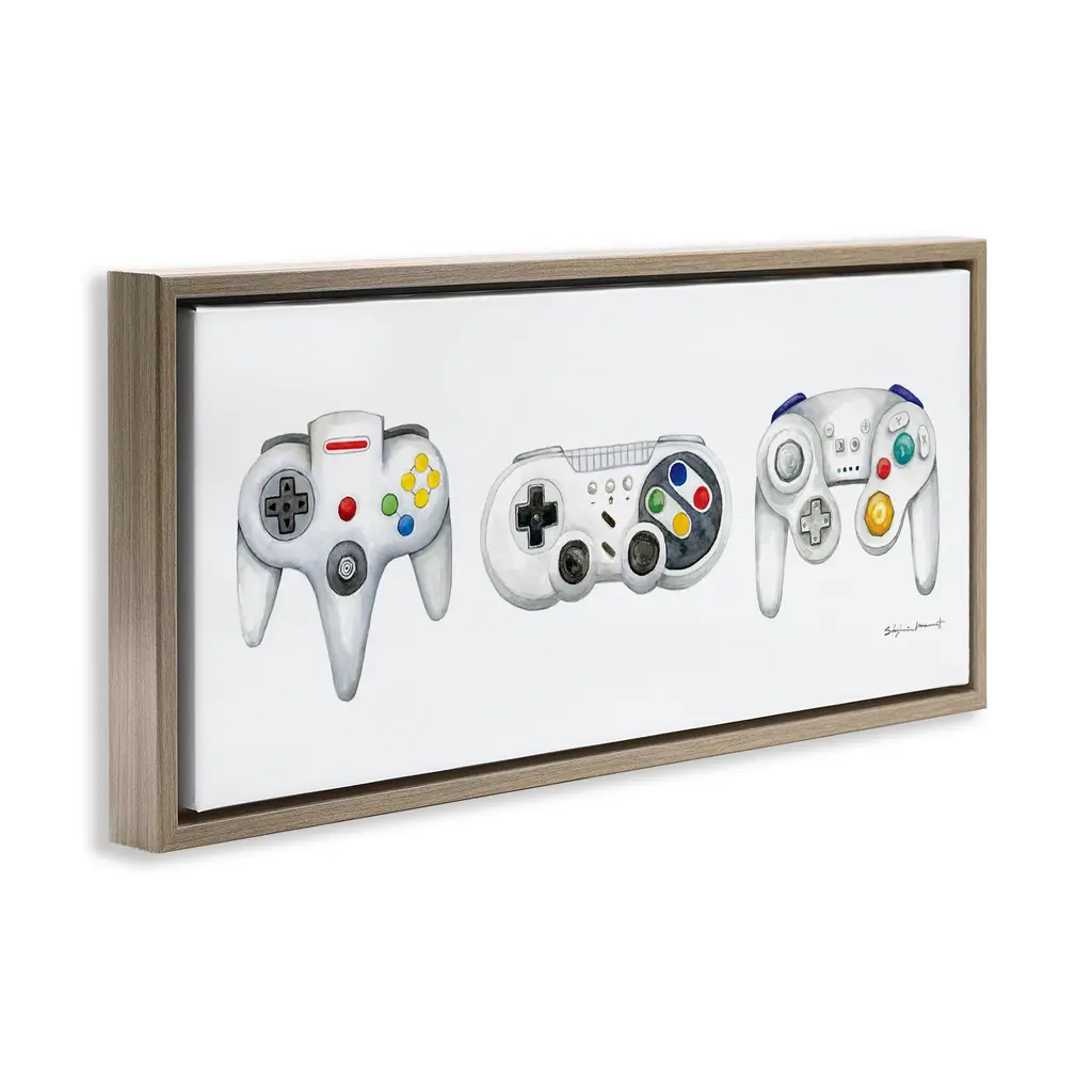 Elevate your home or office to the next level with Stupell Framed Floating Canvas Wall Art. Our premium hand-stretched canvas is mounted securely into a sturdy lightweight frame. The museum-style gap between the wrapped canvas and the box frame gives the illusion of floating artwork. Stupell Wall Art is made in the USA.Features: Dimensions: 25 x 1.7 x 11 Frame, 24 x 1.5 x 10 Canvas ArtFloating Frame Canvas Products are available in sizes 25"x11" and 31"x14". All Floating Frame Canvas Products have a 1.7" Depth.Wall Art is Ready to Hang with Hardware Free Hanging. No Installation required. For Easy Set Up Lean or Layer Artwork on Shelf or Against Wall. Artwork is Permently Fixed into the Frame.Our elevated 1.7" Thick Floating Frame is the perfect complement to our canvas style Wall Art. We use only the highest quality inks in house with industry leading printing solutions. Canvas is hand stretched over a durable wood foundation and then mounted securly into a Modern Box Frame. Made in the USA.Artwork Relates To: Electronics, Joystick, Controller, Video Games, Gaming, VintageDesign by Stephanie Workman Marrott