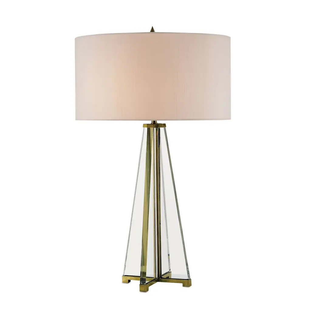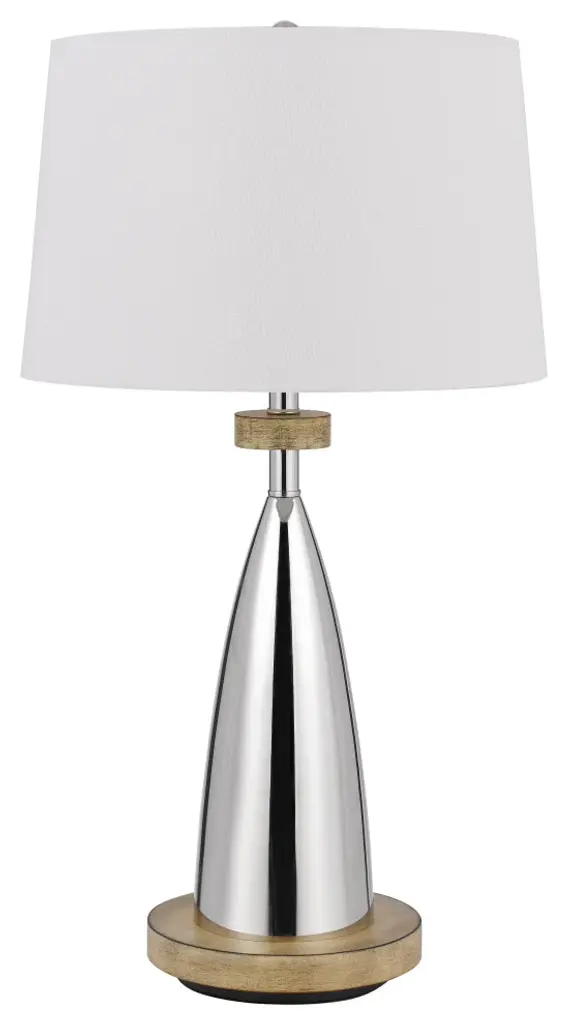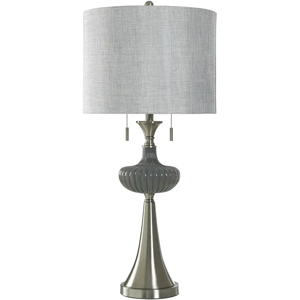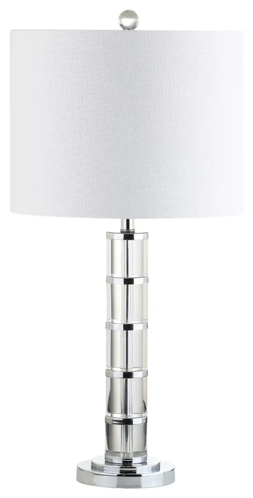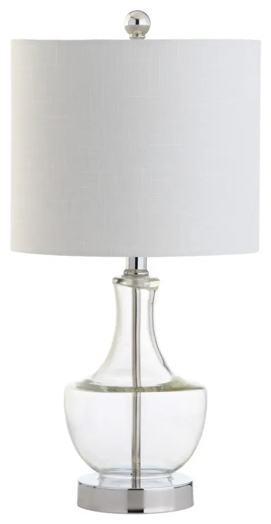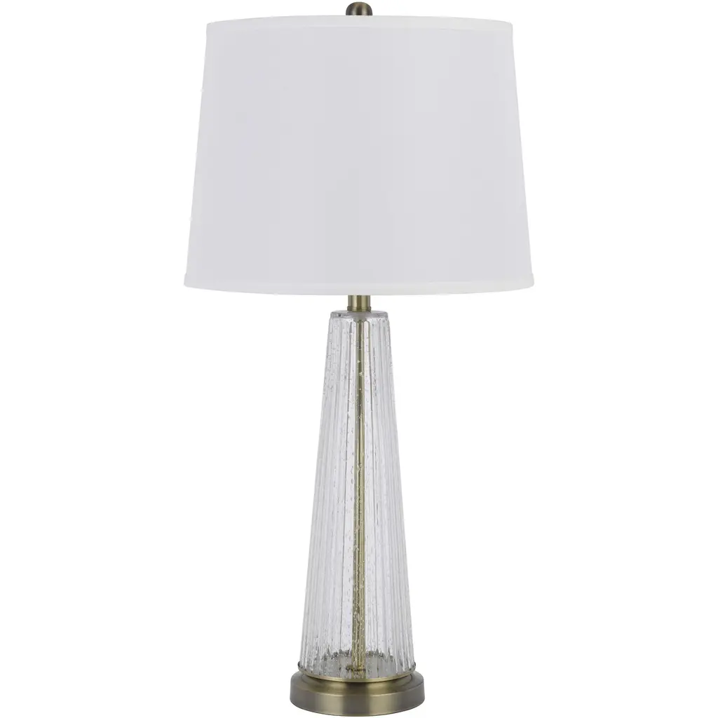This table lamp blends sleek design and practicality, making it a must-have addition to your living room, bedroom, or office. It features a sturdy steel construction and a tapered drum shade made from high-quality fabric. The glass body of the lamp adds a touch of elegance to any setting. With a rotary 3-way switch, you can easily adjust the light to suit your needs.Due to the production process, each piece is unique and no two are exactly alike.Constructed from durable steel and quality glass for longevityFeatures a sophisticated tapered drum shade made of fabricPerfect for enhancing the ambiance in your living room, bedroom, or officeEquipped with a rotary 3-way switchEach piece is unique showcasing the exclusive designMaterial: 60% Glass, 30% Steel, 10% FabricWeight: 4.8 poundsSwitch Type: Rotary 3 WaySwitch Location: SocketSystem Type: Plug-InSocket Quantity: 1Bulb Shape: A21Socket Type: E26Voltage: 120VFixture Dimmable: No