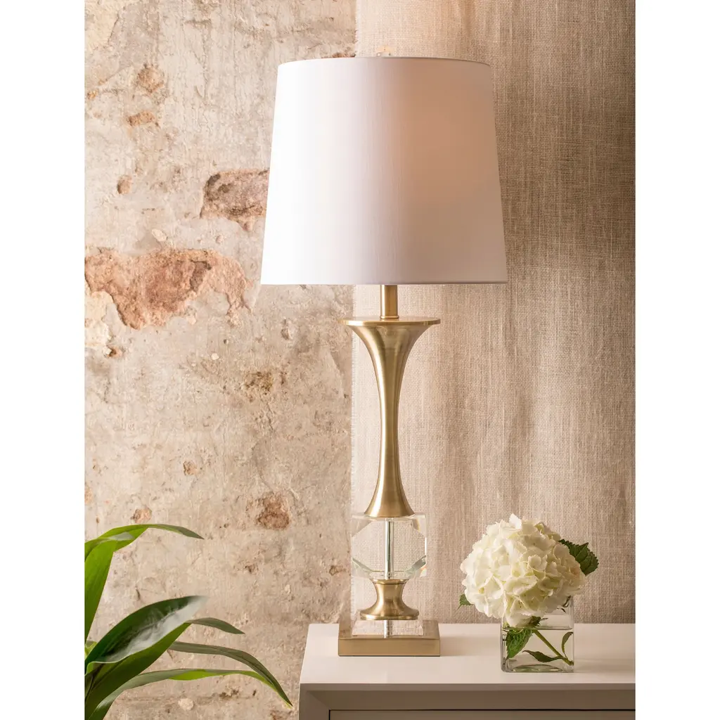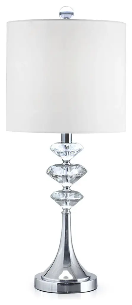 This crystal and steel table lamp uses a sleek and simple base to inspire an elegant modernist look. Topped with a round hardback shade, it uses its long profile and select antique elements — notably, crystal accents — to create a remarkable look. This Table Lamp comes in a crystal and polished nickel crystal and steel frame with a white styrene shade; Requires one (1) 150-watt Incandescent E26 base bulb (not included).