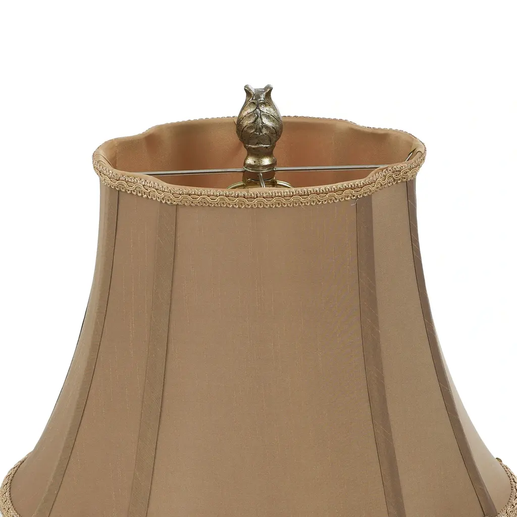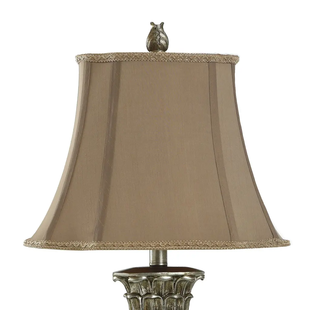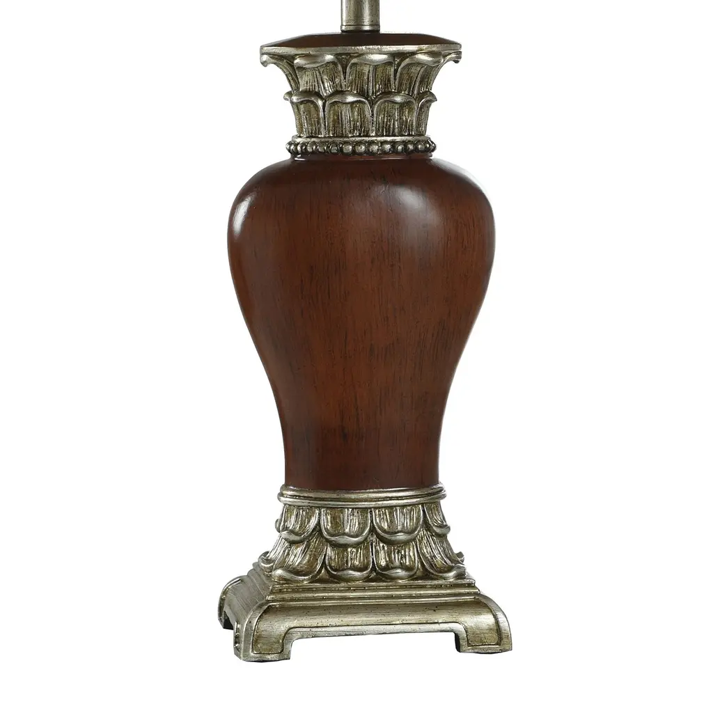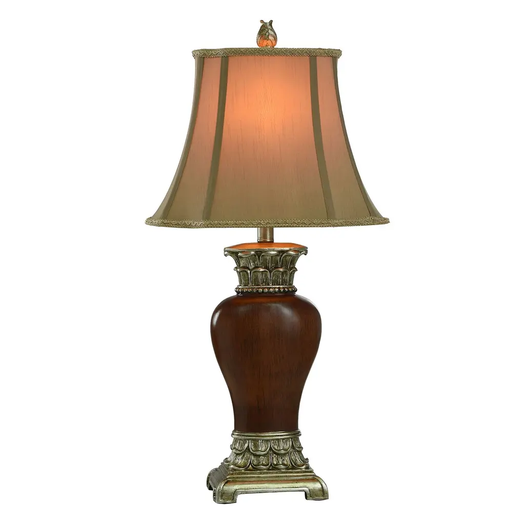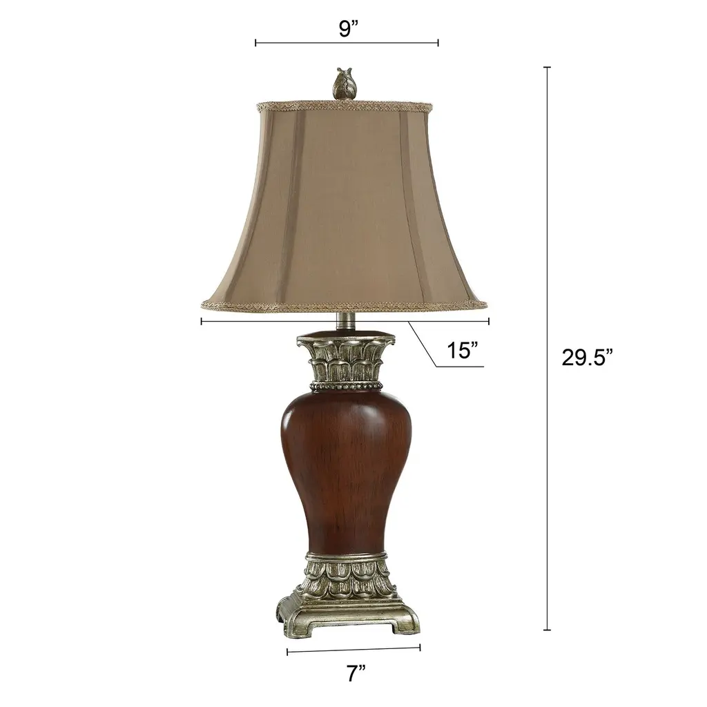 This traditional table lamp is a timeless accessory for your home. Crafted from a sturdy polyester resin, the lamp is durable and can easily withstand the hustle and bustle of everyday use. Its fabric shade diffuses the light peacefully, making it perfect for any setting. Be it for some late-night reading in your bedroom or to light up your office space, it's a perfect fit. Plus, it could be used to bring a warm glow in the living room or dining room during lovely family dinners. This table lamp, with its traditional style, seamlessly blends into any decor theme.Due to the production process, each piece is unique and no two are exactly alike.Crafted with sturdy polyester resin for durabilityFabric shade for warm, diffused lightPerfect for use in the bedroom or officeMaterial: 75% Polyester Resin, 25% FabricWeight: 3.98 poundsSwitch Type: On/OffSwitch Location: On SocketSystem Type: Plug-InSocket Quantity: 1Bulb Shape: A19Socket Type: E26Voltage: 120VFixture Dimmable: No