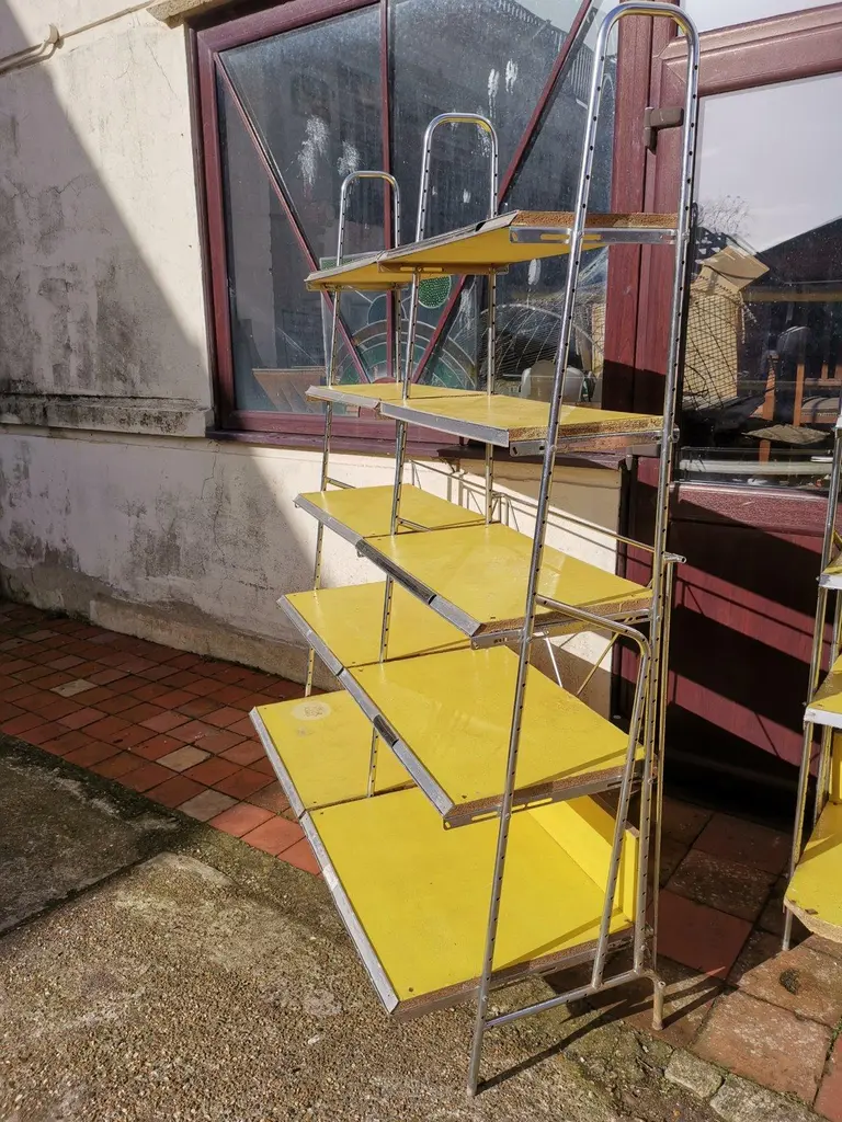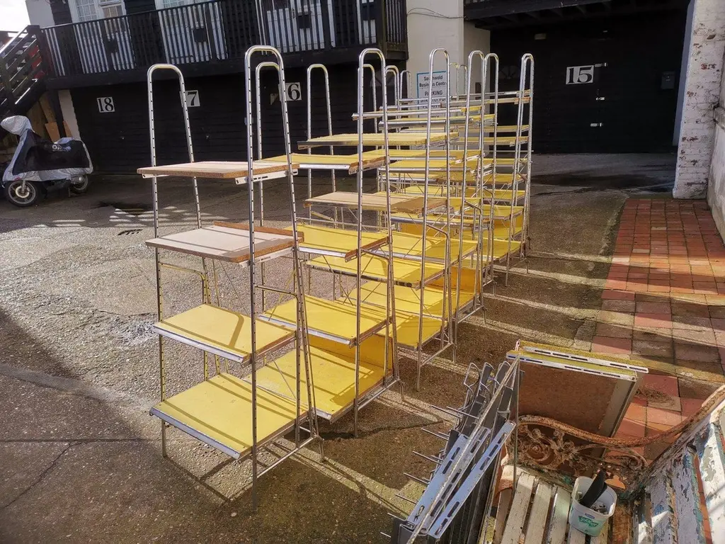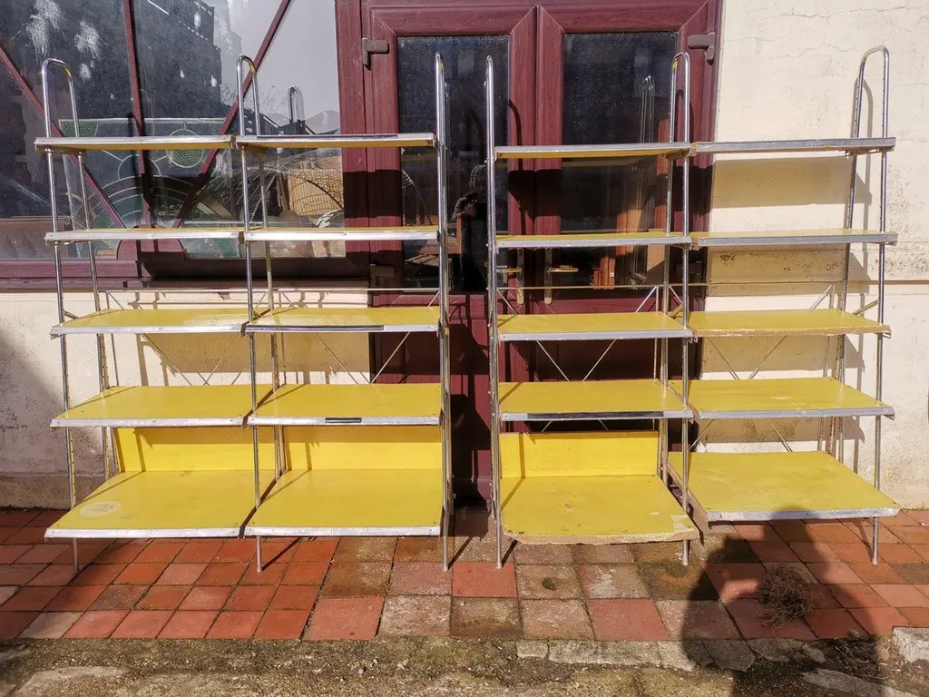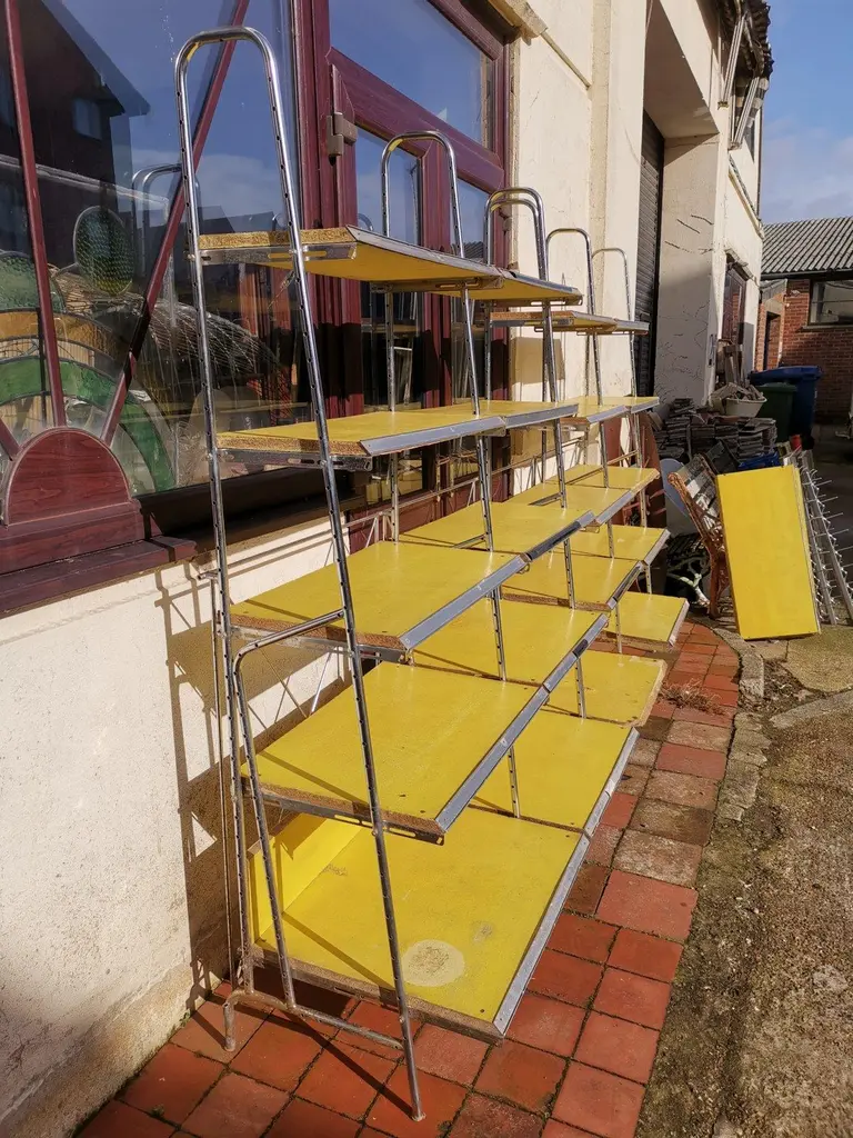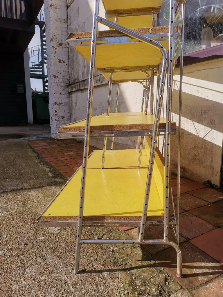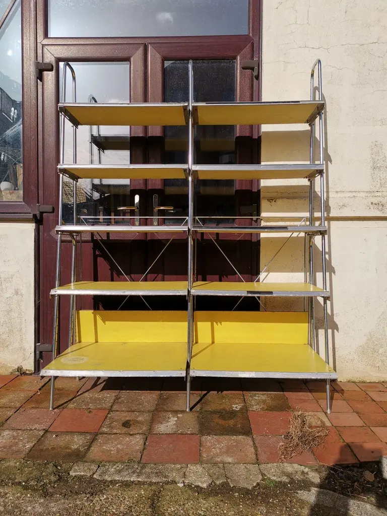 Stylish midcentury chrome on steel adjustable shop shelving with braced back supports and graduating, very strong. They can be bolted together in long lines if required with adjustable shelves. All the same heights, some are identical and some are different widths and various sizes, see below.2 x Doubles - 56.5 inches wide, 73 inches tall. Shelves are all 26.5 inches wide.2 x 13 inches depth, 1 x 15.5 inches depth, 1 x 17.5 inches depth, 1 x 21.5 inches depth.3 X Large Singles. All 37 inches wide in total, All 73 inches tall.Set 3 - 1 x 13 inches depth 2 x 15 inches depth, 1 x 17 inches depth 1 x 22.5 inches depth.3 x Back braces together - 107.5 inches wide.2 x Small Singles - 29 inches wide in total, 73 inches tall. Shelves are 26.5 inches wide.Set 1 shelves - 1 x 13 inches depth, 2 x 15.5 inches depth, 1 x 20.5 inches depth.Set 2 shelves - 1 x 12.5 inches depth, 2 x 15 inches depth, 1 x 17.5 inches depth.3 x Wine holders 43.5 inches wide, 7 inches depth.Spare shelves 34.5 inches wide, 1 x 13 inches depth, 3 x 15.5 inches depth, 2 x 17.5 inches depth, 1 x 22 inches depth.Spare shelves 26.5 inches wide, 1 x 17.5 inches depth.Empty shelves 34 inches wide, 1 x 13 inches depth, 1 x 15.5 inches depth, 1 x 18inches depth.