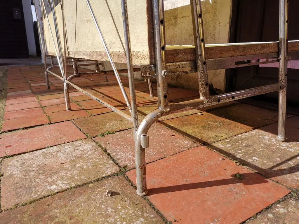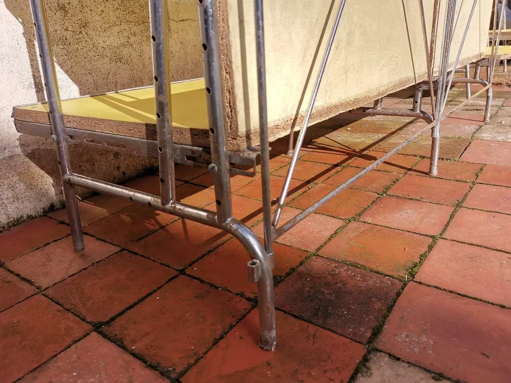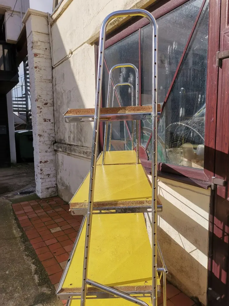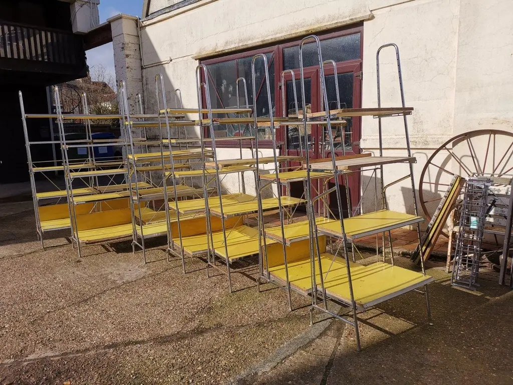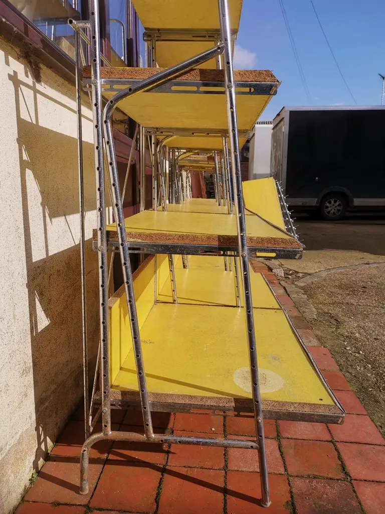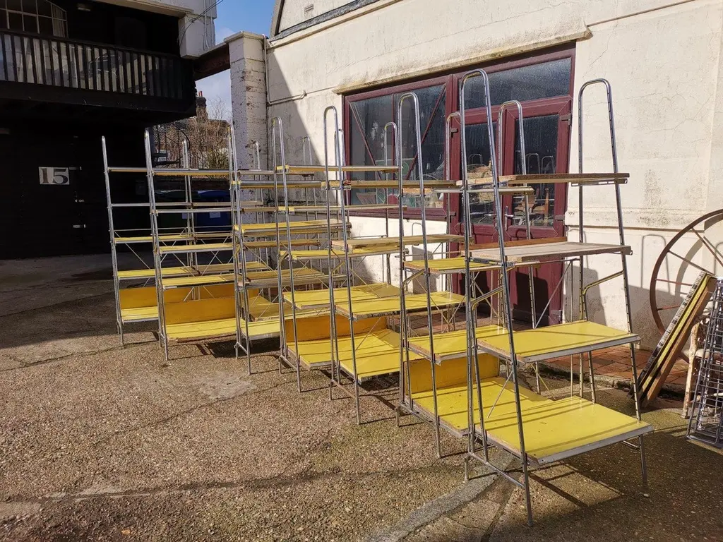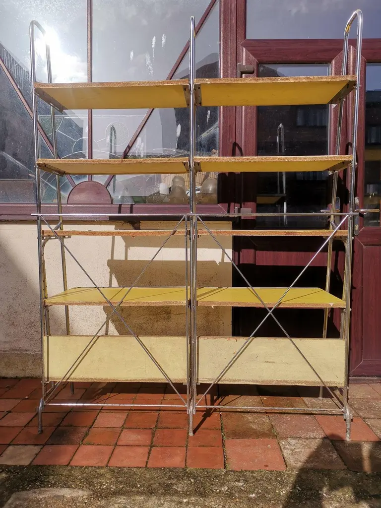 Stylish midcentury chrome on steel adjustable shop shelving with braced back supports and graduating, very strong. They can be bolted together in long lines if required with adjustable shelves. All the same heights, some are identical and some are different widths and various sizes, see below.2 x Doubles - 56.5 inches wide, 73 inches tall. Shelves are all 26.5 inches wide.2 x 13 inches depth, 1 x 15.5 inches depth, 1 x 17.5 inches depth, 1 x 21.5 inches depth.3 X Large Singles. All 37 inches wide in total, All 73 inches tall.Set 3 - 1 x 13 inches depth 2 x 15 inches depth, 1 x 17 inches depth 1 x 22.5 inches depth.3 x Back braces together - 107.5 inches wide.2 x Small Singles - 29 inches wide in total, 73 inches tall. Shelves are 26.5 inches wide.Set 1 shelves - 1 x 13 inches depth, 2 x 15.5 inches depth, 1 x 20.5 inches depth.Set 2 shelves - 1 x 12.5 inches depth, 2 x 15 inches depth, 1 x 17.5 inches depth.3 x Wine holders 43.5 inches wide, 7 inches depth.Spare shelves 34.5 inches wide, 1 x 13 inches depth, 3 x 15.5 inches depth, 2 x 17.5 inches depth, 1 x 22 inches depth.Spare shelves 26.5 inches wide, 1 x 17.5 inches depth.Empty shelves 34 inches wide, 1 x 13 inches depth, 1 x 15.5 inches depth, 1 x 18inches depth.