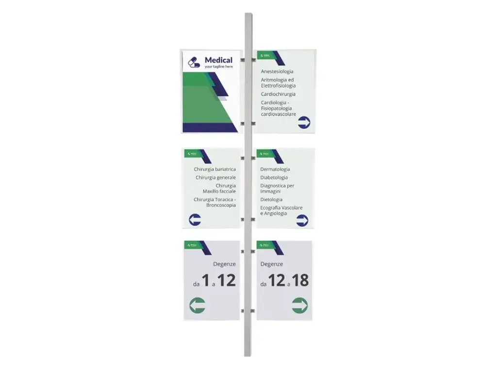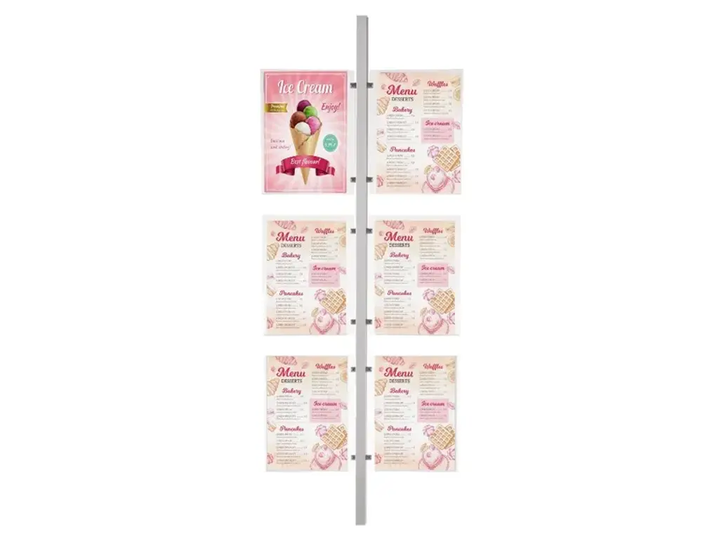 SU6XA4INUNO is a customizable wall signage with 6 pockets A4.InUno line of interior office wall signs for displaying multiple graphics to create different directions. It consists of 6 transparent pockets in A4 size, easily opened to insert graphics and change them as needed. Support for making wall signage with a new, minimal and essential look. Essential and elegantIts essential character is given by its few elements: aluminum central upright, A4 transparent pockets and side clamps. This corporate signage stand is ideal for elegant settings that require signage that is simple and also interchangeable over time.InUno the made-in-Italy proposal for furniture and communication solutions.