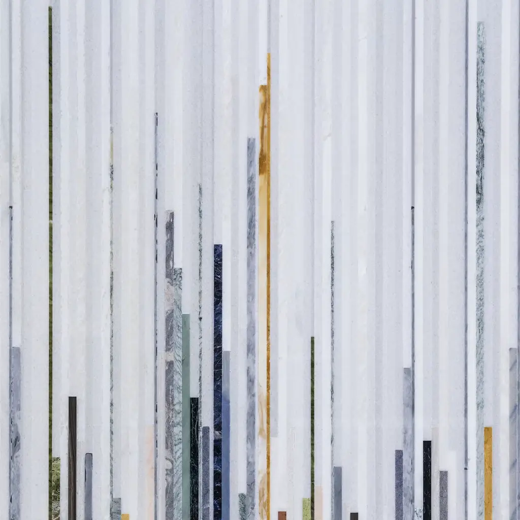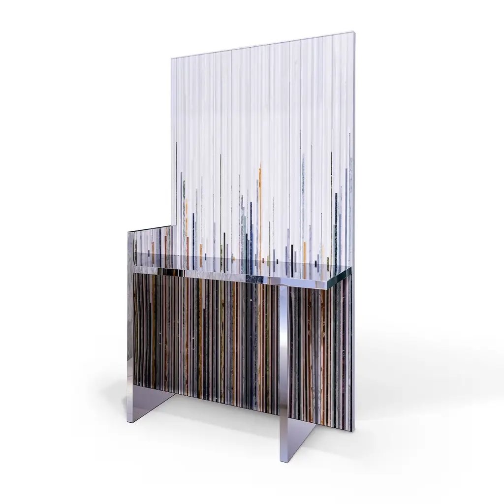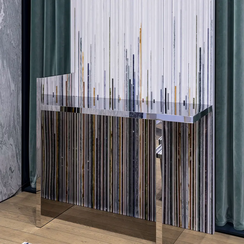 The Subarashi Consolle, from the exclusive Fragment Collection by Gwenael Nicolas for Budri - unveiled at the Milan Design Week 2022, with a strong scenic impact, is one of a kind: it is composed of a self-standing cladding made of polychrome marble rods. Like a fabric, the vertical surface fades from white marbles to a free fall of color stripes at the bottom. The pattern made of precious materials, including the Sodalite, is reflected onto the mirror console top.