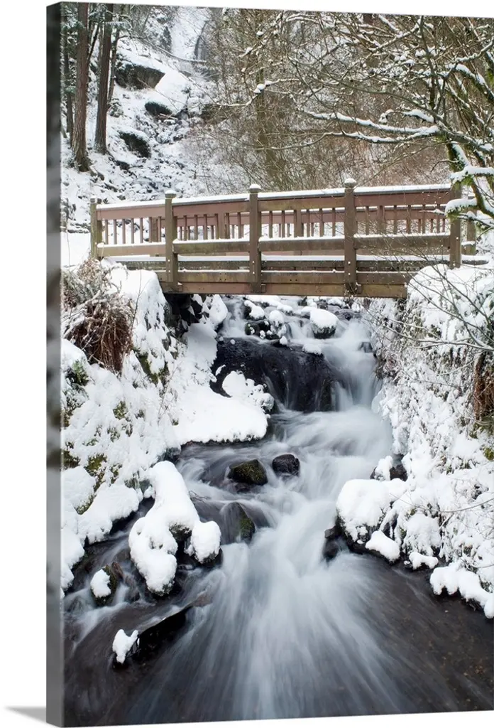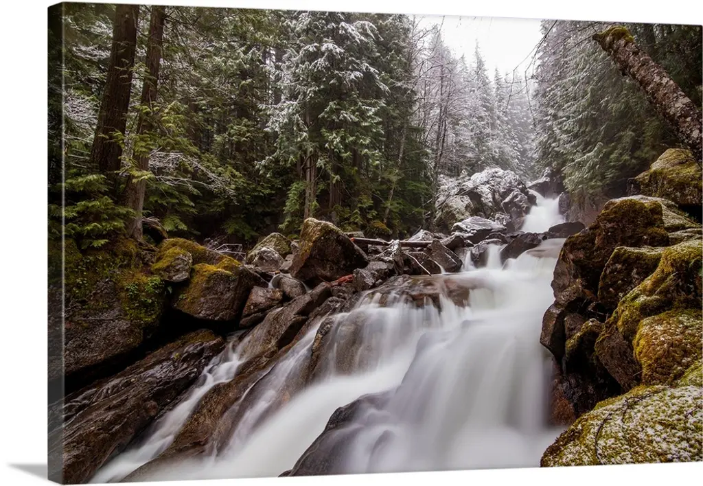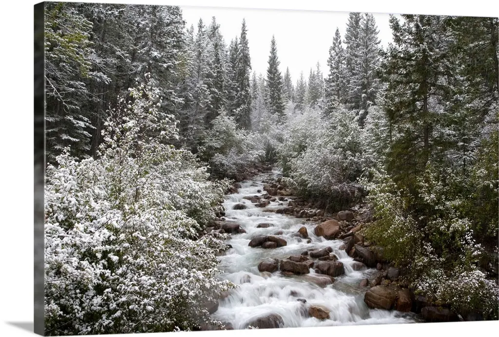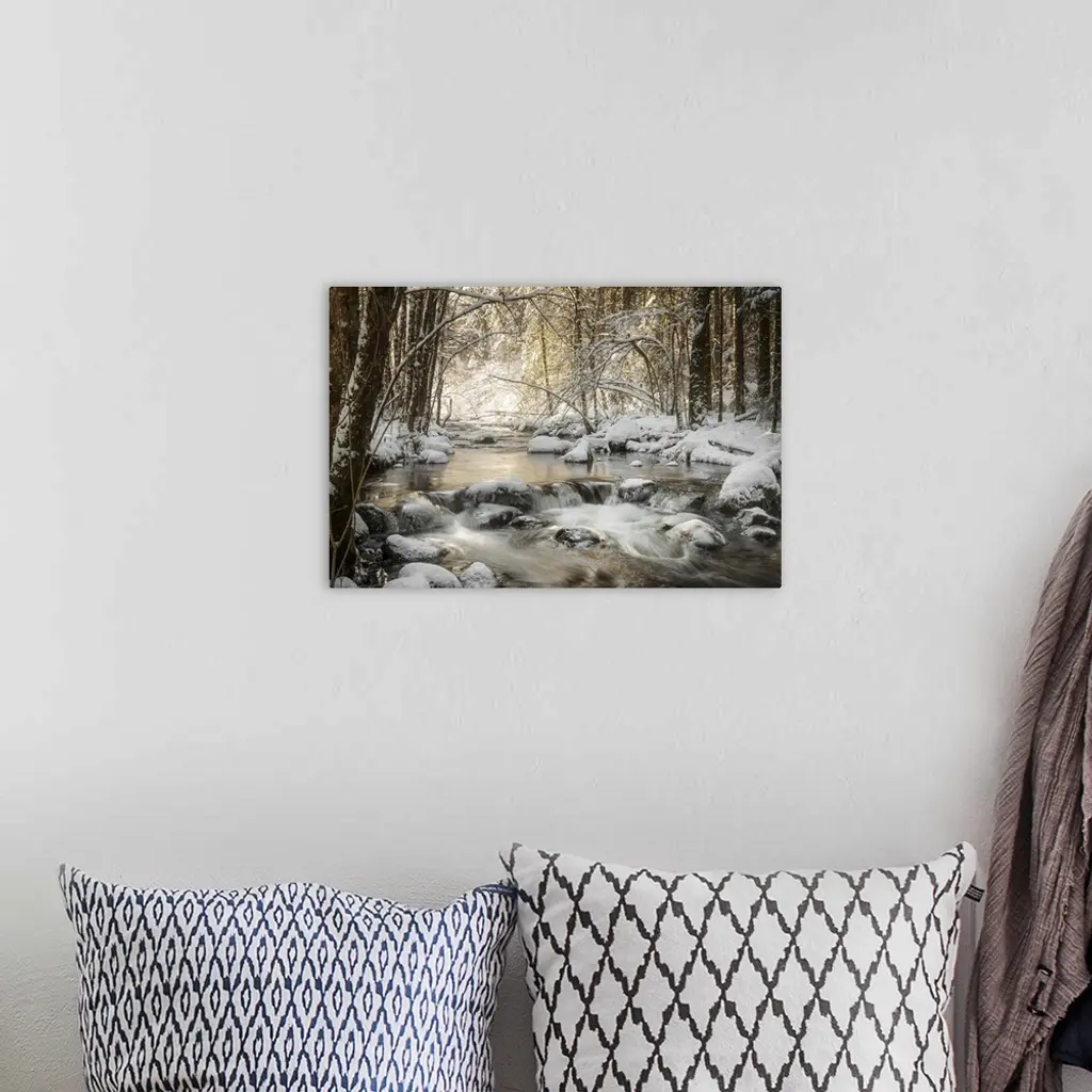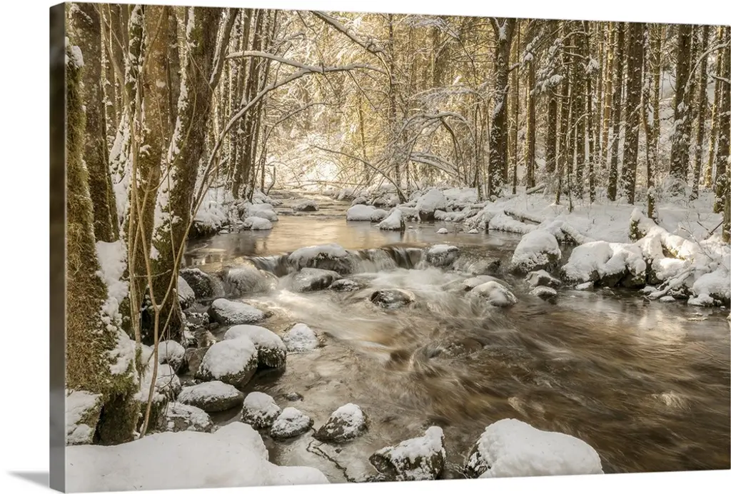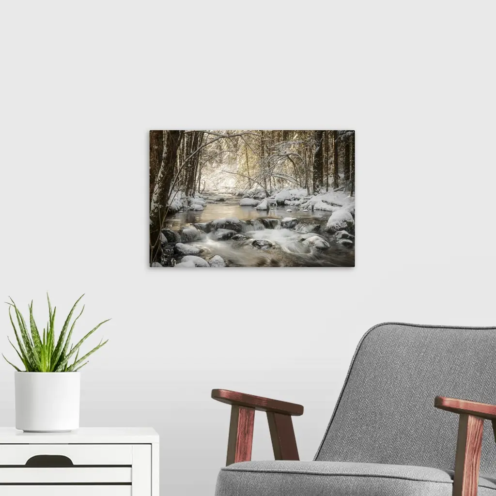 Photograph of a flowing river in the middle of the woods surrounded by snow covered rocks and trees.