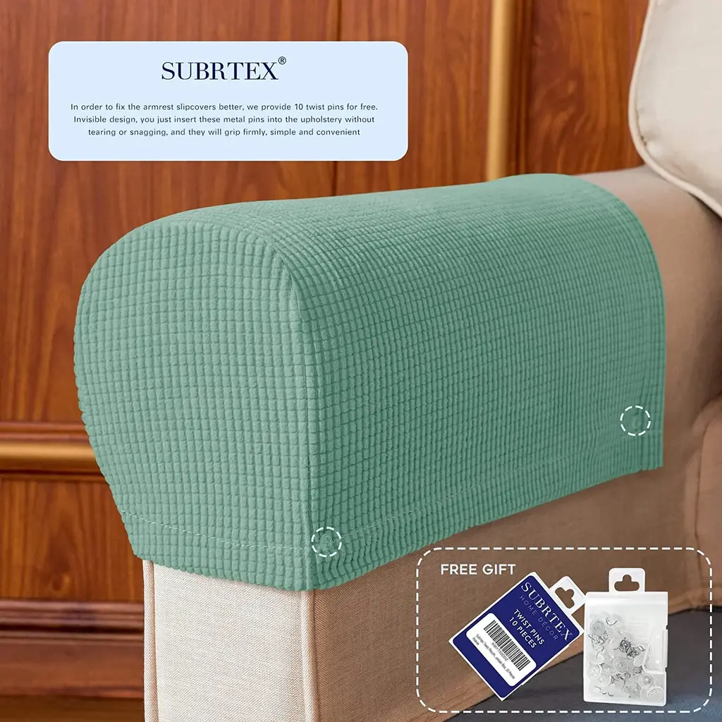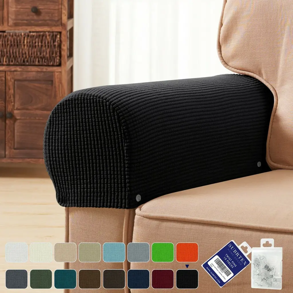 Subrtex sofa armrest slipcover would give your sofa armrests a brand new look while protecting them from daily wear and tear, stains, and scratches. Make your sofa keep pristine longer. It's easy to install, take off, and machine washable. A must-have for homes with children and pets. Products Features:Material:Perfect Fit: Our armrest covers are suited for more than 97% of fabric chair armrests. Please Note: Our cover is more suitable for fabric sofas. Function:Give your armrests a brand new look while protecting them from daily wear and tear, stains, and scratches. Extend the life of your armrest or fix a broken and worn out armrest quickly and effortlessly. A must-have for homes with children and pets. EASY CARE:Machine washable, no bleach. Low-temperature ironing if needed. Product Specification:Size: Suitable for armrests that are 18-21 inches long, 5-8 inches wide, and 8-11 inches high. One-size-fits-most, each package includes a pair of armrests and 10 rivets for better fitting. Notice: Because of the different light and different computer screen resolutions, the color showed on the screen may be slightly different from the actual one.