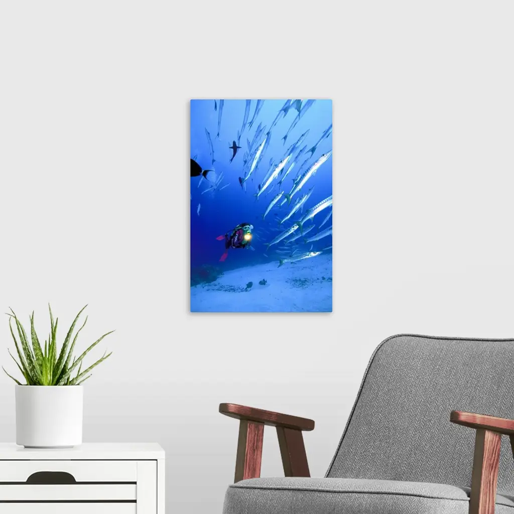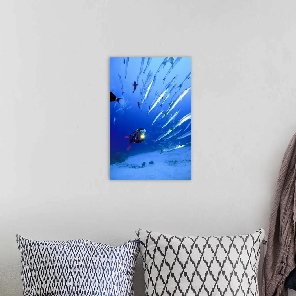 Sudan, Red Sea, Sanganeb Reef, school of Barracuda wall art for home and office decor. Discover canvas art prints, photos, mural, big canvas art and framed wall art in GreatBigCanvas.com's varied collections.