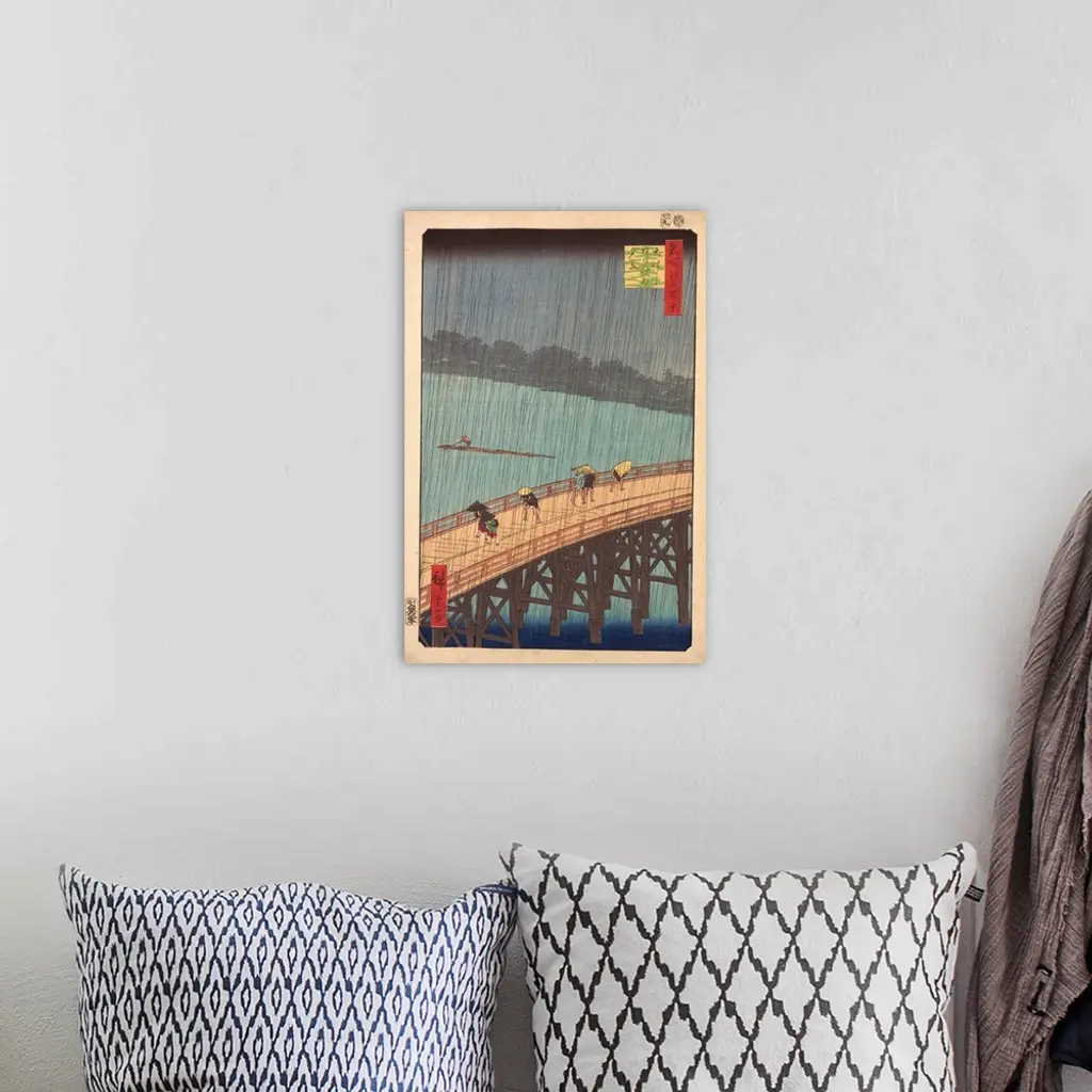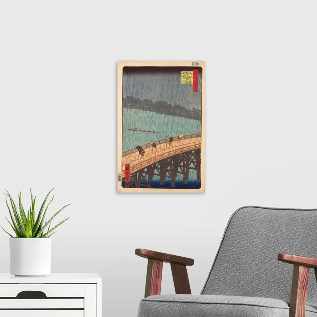 The heavens open. The sudden shower, a favorite subject of Edo haiku poets and ukiyo-e artists, is often depicted with a crisscrossing pattern of fine lines of rain-a difficult woodblock technique. Here, the netlike pattern is superimposed over an intensely focused image of Ohashi (the Great Bridge), which crosses the Sumida River.