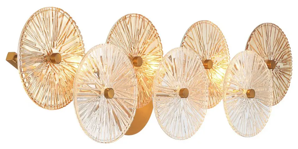 Grand robust detailing is showcased through exemplary glasswork. The pressed ribbed discs are each handmade intricately detailed and naturally tinted. These features add to the unique characteristics of each individual piece in this majestic collection.Number of Lights: 3Bulb Type: E12/CandelabraWattage: 60LED Color Temperature (K): Does not applyDimmable: YesBulb Inlcuded: NoVoltage: 120Hardwire or Plugin: Hardwired