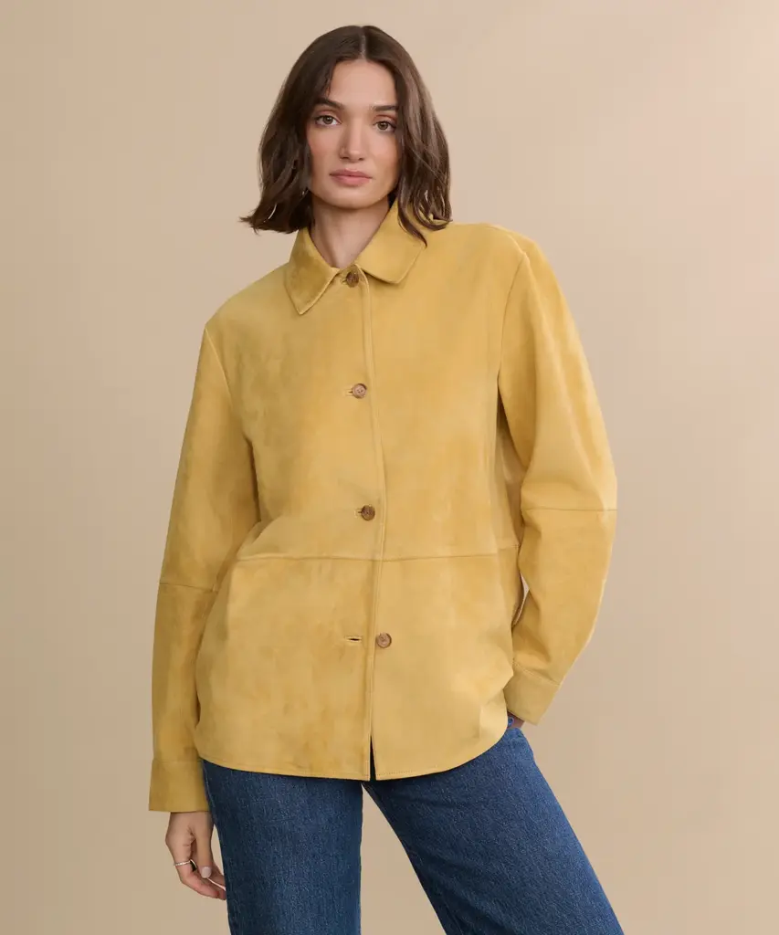 Suede Lennox Jacket Honey A lightweight, buttery-soft suede layer that’s cut like a jacket but styled like a shirt—what we lovingly call a shacket. Designed in a rich deep honey shade and tailored with an easy, generous fit, it’s made to be worn open or buttoned up, but don’t plan on tucking it in.