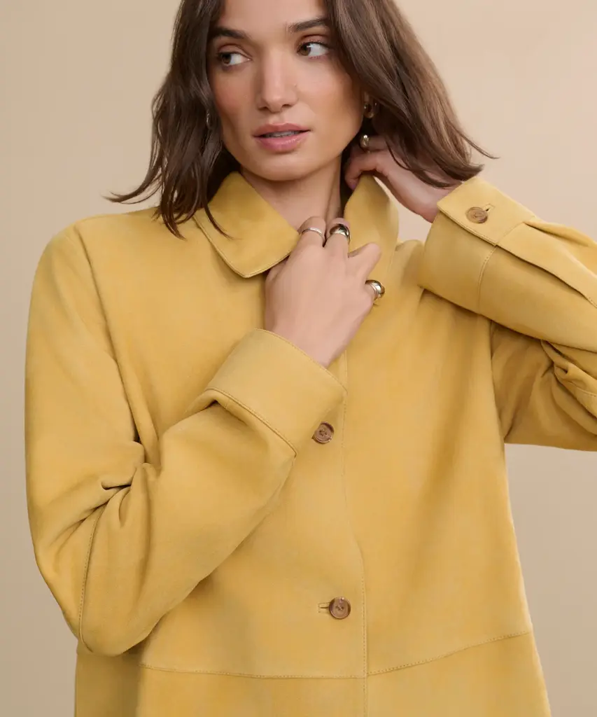 Suede Lennox Jacket Honey A lightweight, buttery-soft suede layer that’s cut like a jacket but styled like a shirt—what we lovingly call a shacket. Designed in a rich deep honey shade and tailored with an easy, generous fit, it’s made to be worn open or buttoned up, but don’t plan on tucking it in.