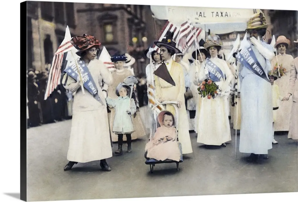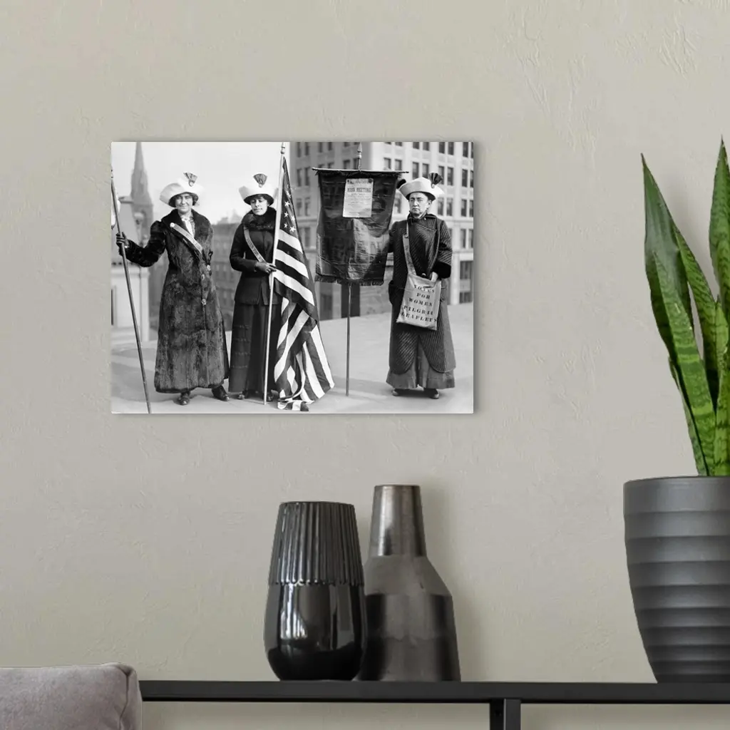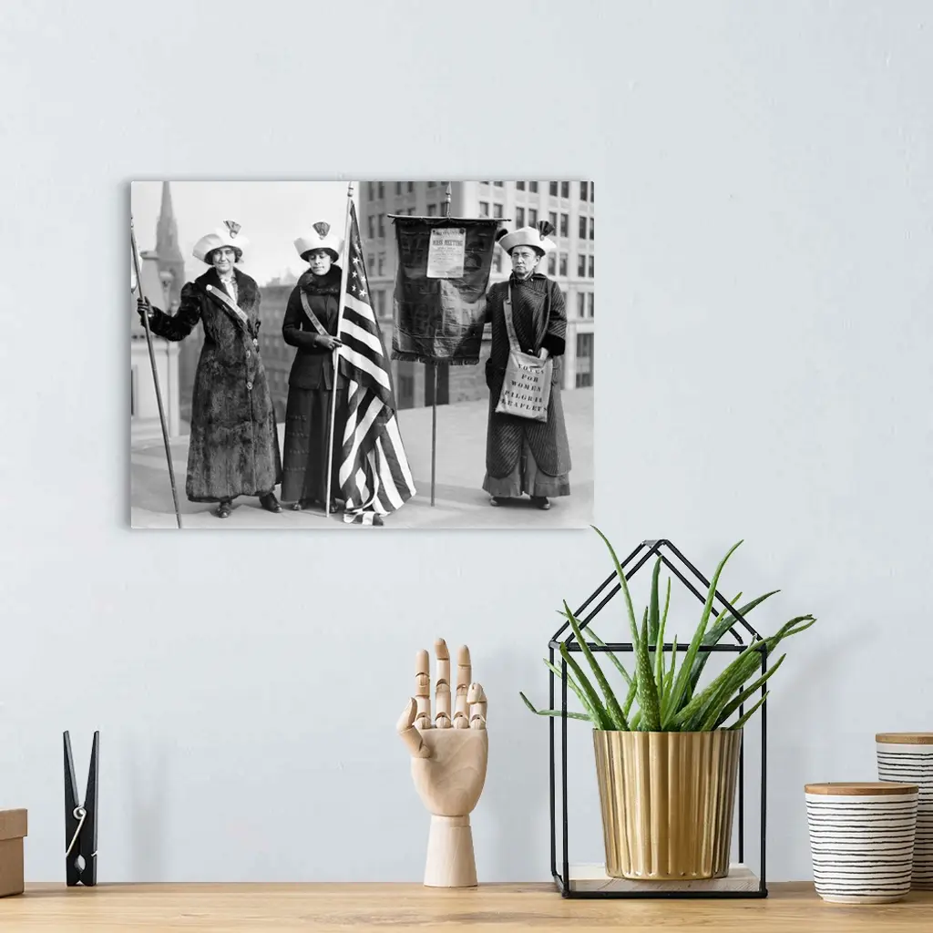 Three women photographed on a Brooklyn rooftop before a demonstration for women's right to vote. One woman holds a poster for the Women's Suffrage Party announcing a mass meeting at the Brooklyn Academy of Music. Photograph, c1910.