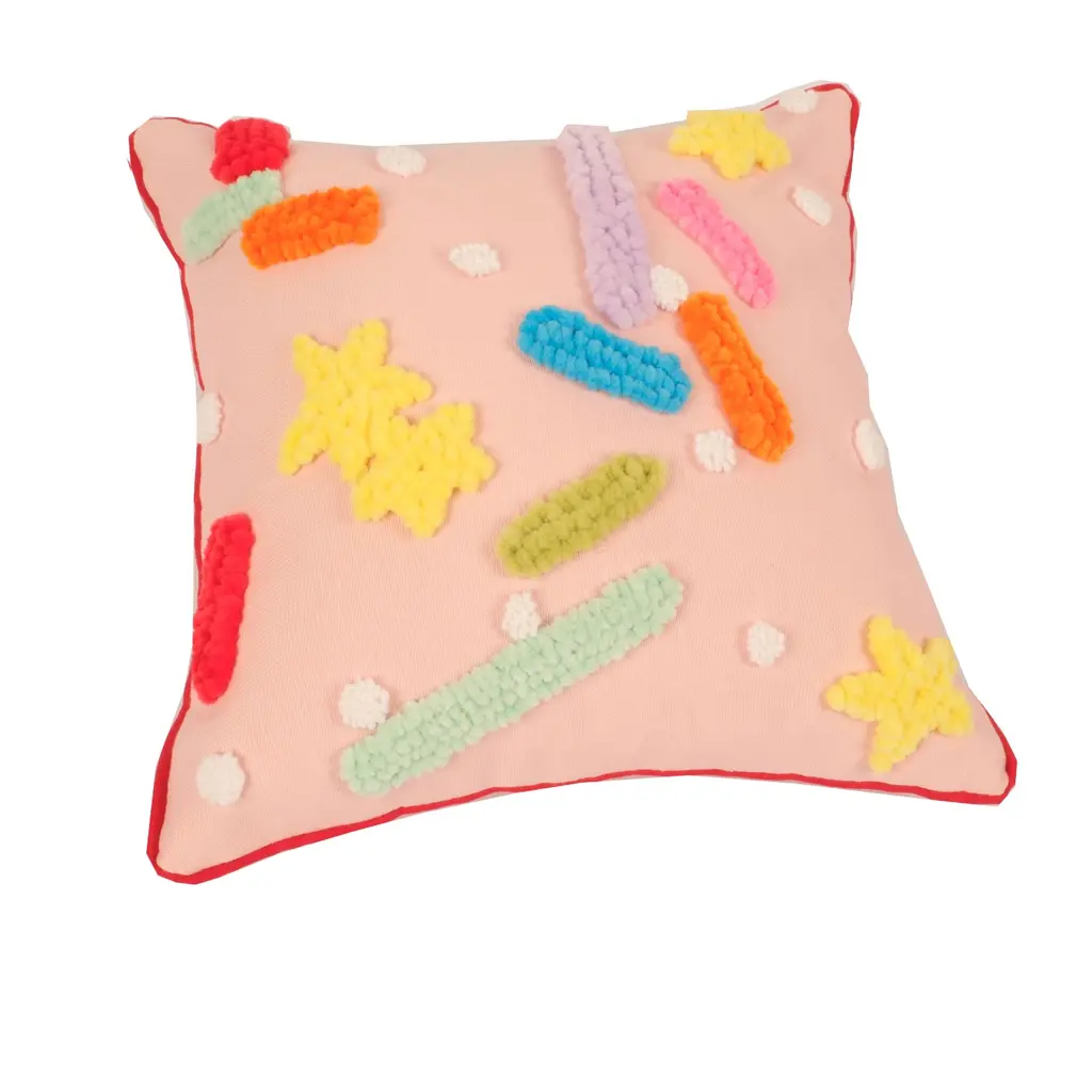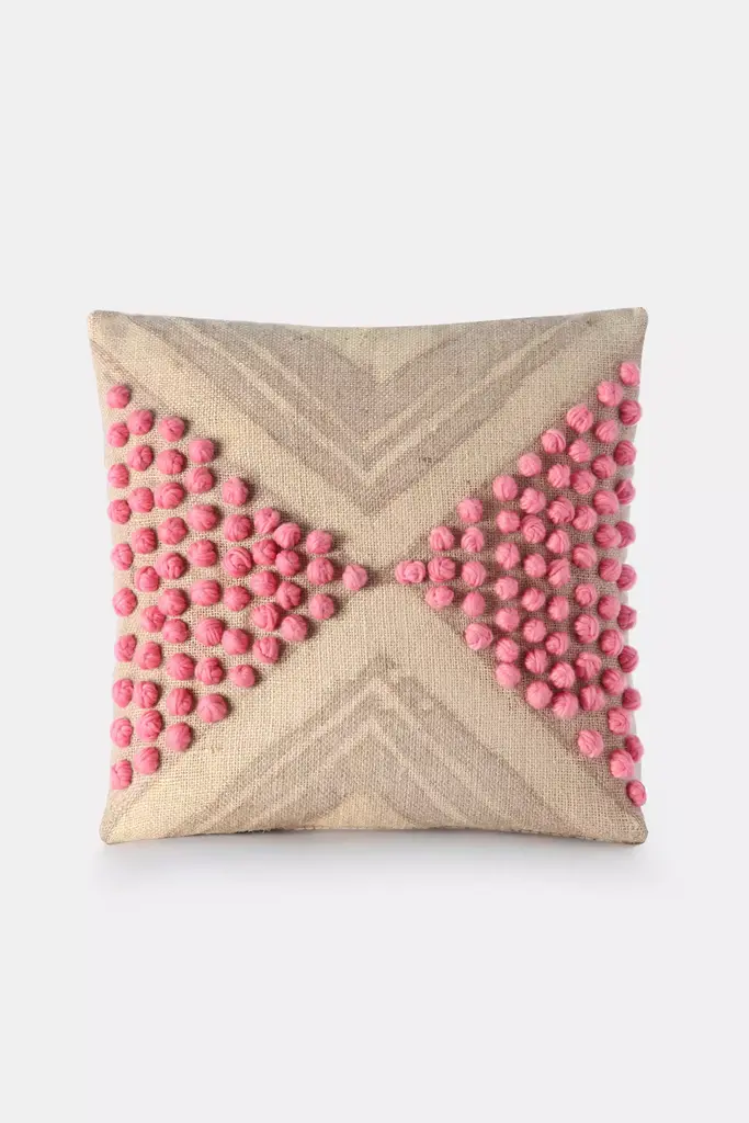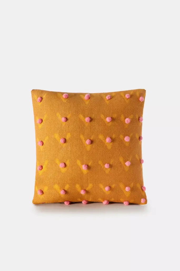 Sugar pie cushion is hand made done by punch technique. Colorful shapes are done by cotton and velvet threads. There is velvet piping around the cushion. This cushion brings happiness to your living room. The cushion comes with its inner cushion pad