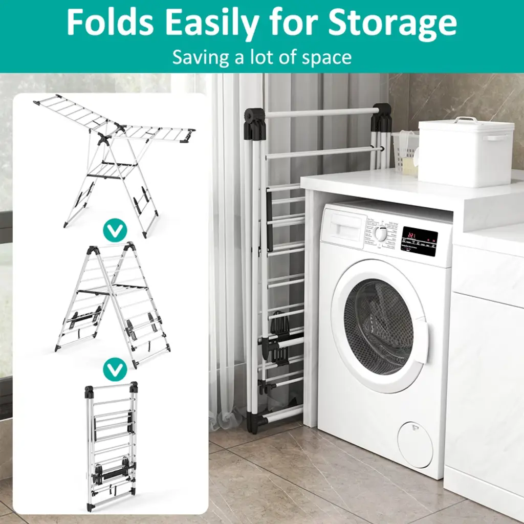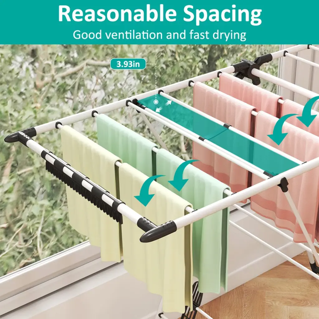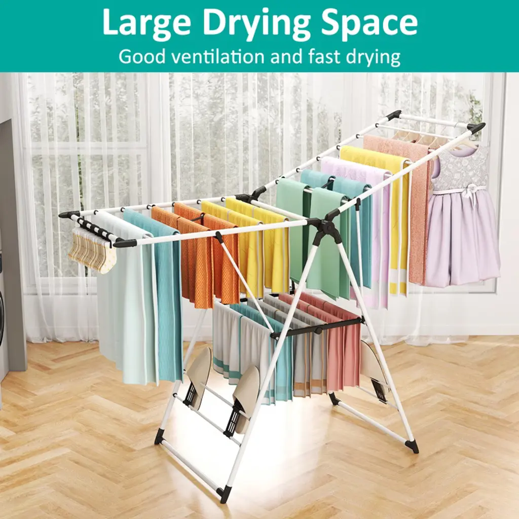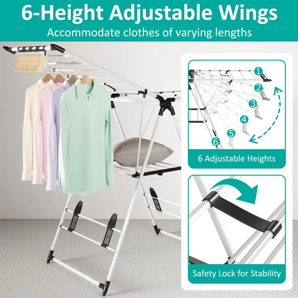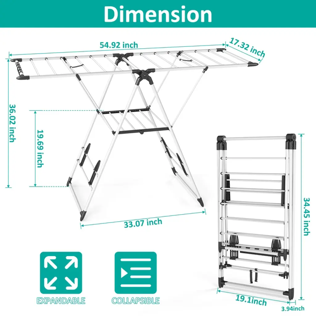 Air-dry clothes efficiently with this adjustable, foldable clothes drying rack. Designed with 6 height levels and rust-resistant stainless steel, it holds multiple garments without sagging. The wide 54.9" frame provides ample drying space, while its collapsible design saves room when not in use—ideal for apartments, laundry rooms, or patios. Features Features 20 rails and 4 shoe slots for efficient garment and shoe drying. Supports up to 70 lbs, making it ideal for heavy laundry loads. Weighs just 6.2 lbs, allowing for easy movement indoors or outdoors. Adjustable wings accommodate various garment sizes for versatile drying. Folds for compact storage, making it perfect for small spaces. Rustproof aluminum construction ensures durability and long-term use. Anti-slip feet provide stability and protect floors from scratches. Specifications Material: Metal Assembled Size: 55" x 17" x 36" (L x W x H) Weight: 6.2 lbs. Package Includes: 1 x 2-Tier Drying Rack 1 x User Manual