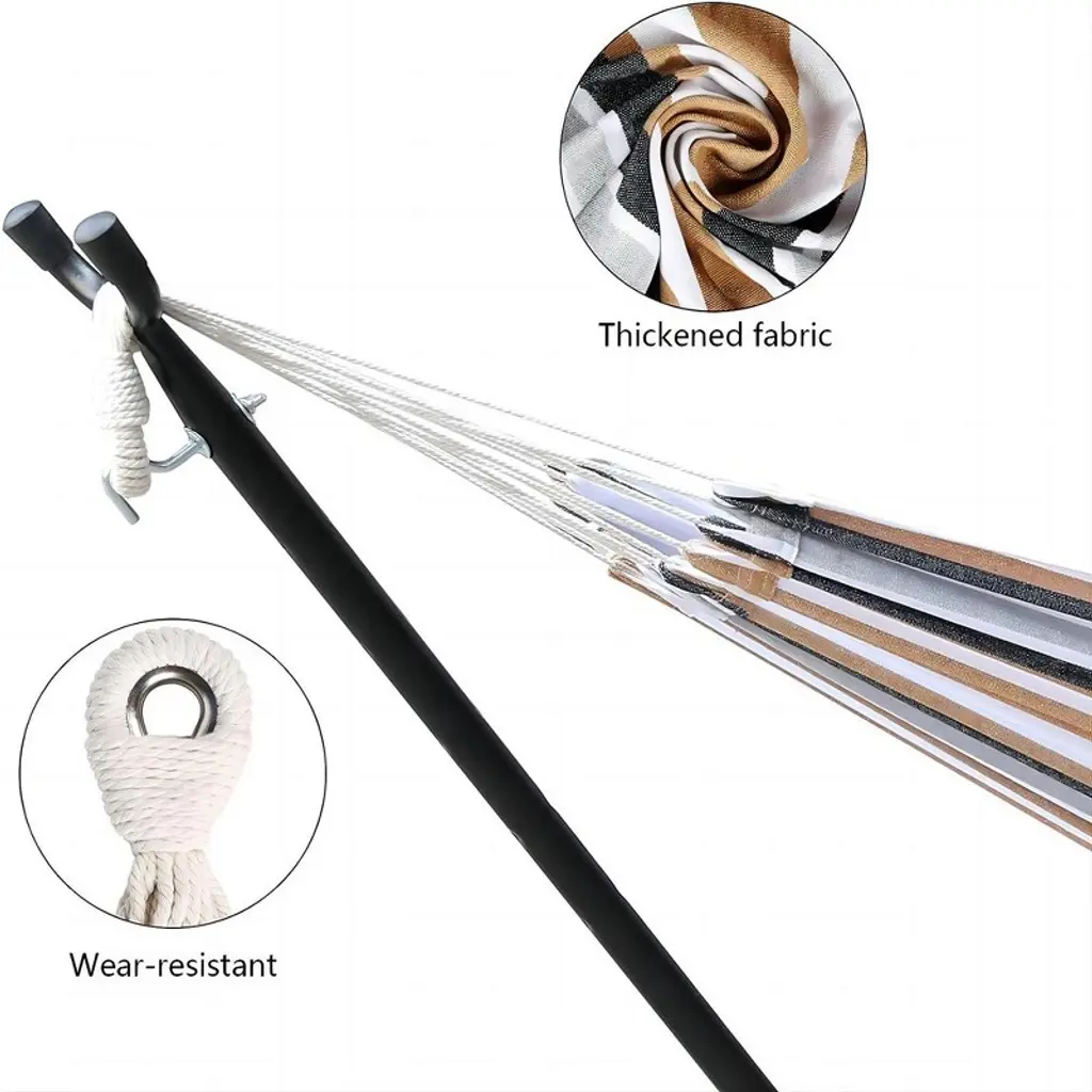 The SUGIFT Double Hammock with Stand offers the ultimate outdoor relaxation experience. This all-in-one set features a sturdy steel stand and a vibrant Brazilian-style cotton hammock, perfect for two. Supporting up to 450 lbs, it’s designed for shared comfort and durability. The adjustable chains and non-slip foot pads ensure stability on any surface, while the weather-resistant finish makes it perfect for all seasons. Enjoy quick, tool-free assembly and easy transport with the included carrying bag, making it ideal for any relaxing spot, from your backyard to the beach. Features Adjustable chains fit various hammock sizes. Steel frame supports heavy weight and resists deformation. Non-slip foot pads provide stability and prevent sliding. Waterproof, rustproof surface ensures easy maintenance. Ideal for backyard, beach, balcony, or poolside use. Includes an oxford storage bag for portability. Tool-free assembly makes setup simple. Specifications Overall Dimensions: 115" (L) x 48" (W) x 43" (H) Bed Size: 76" (L) x 57" (W) Weight: 30 lbs Material: Cotton, Steel Weight Capacity: 450 lbs