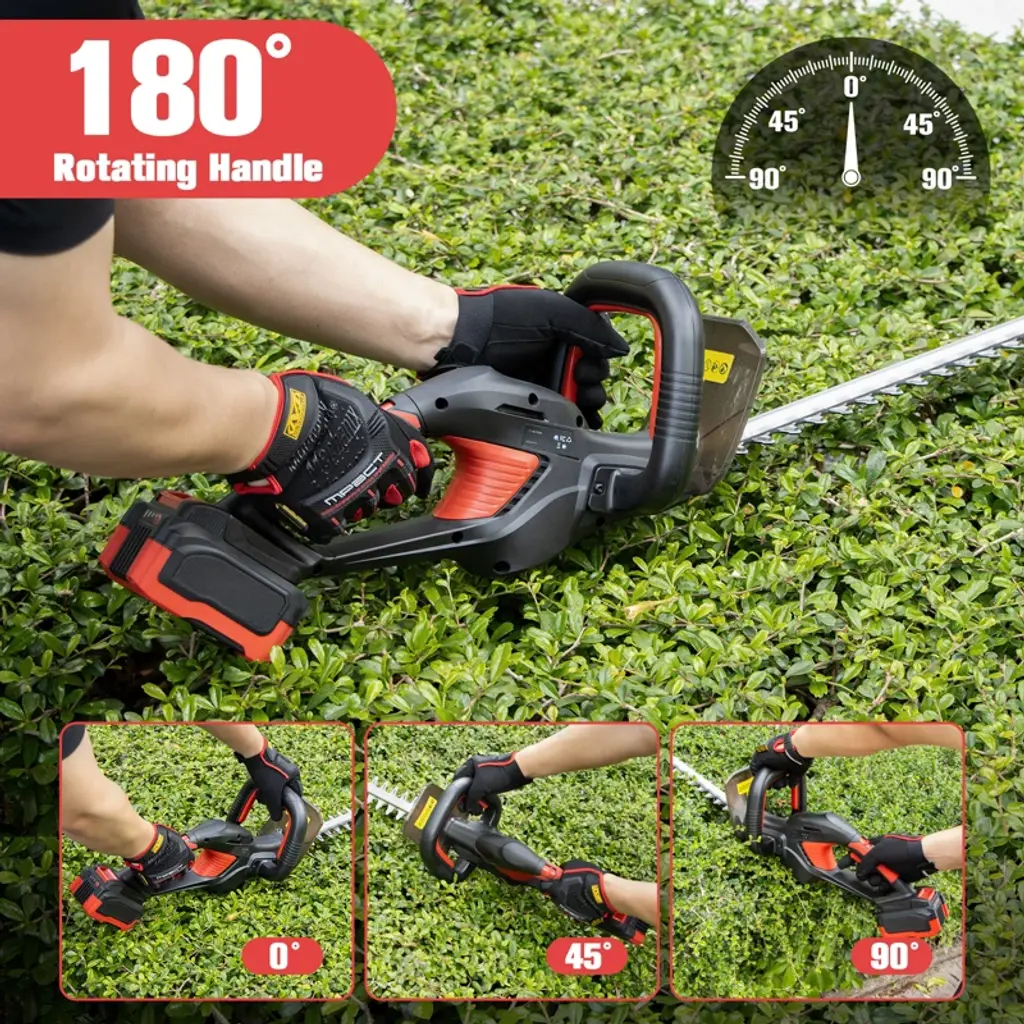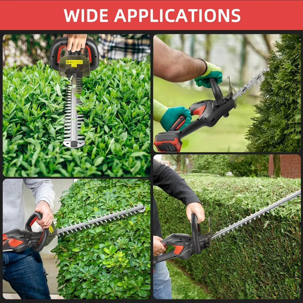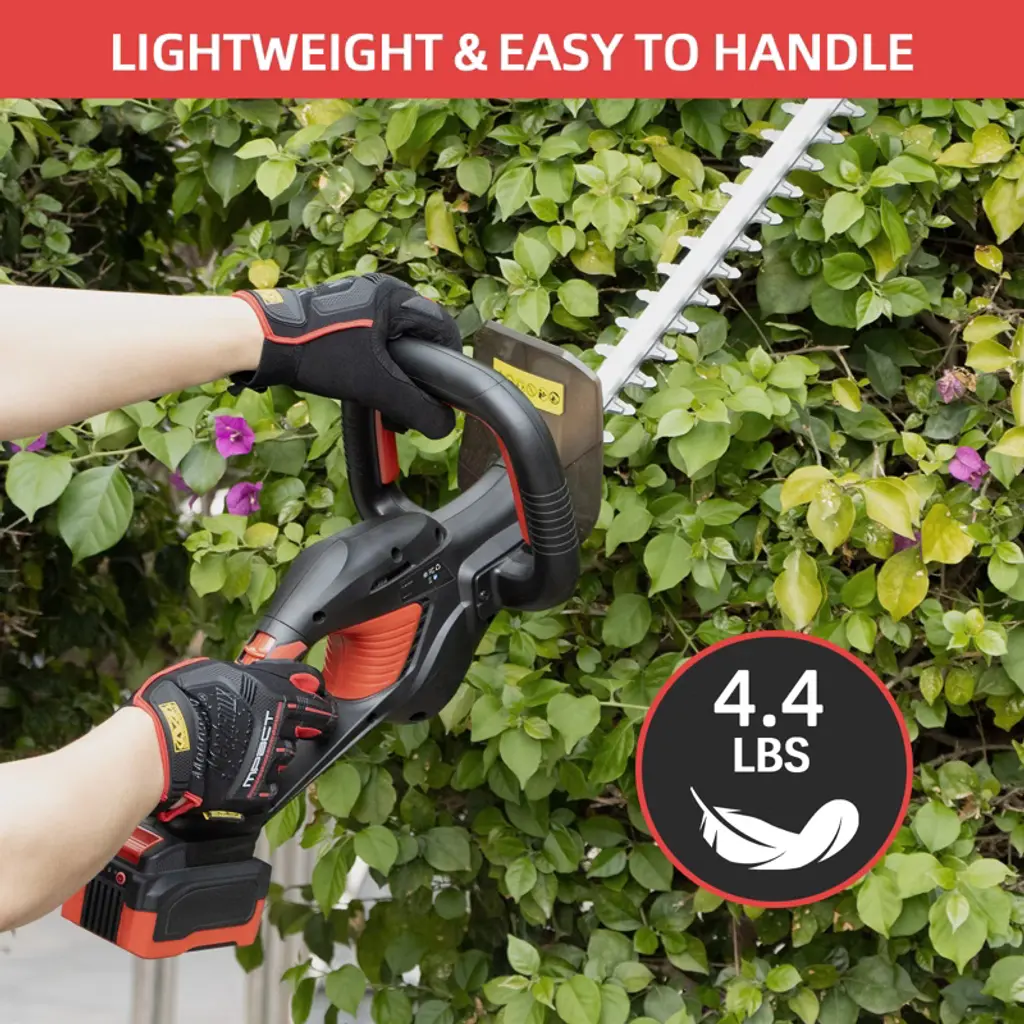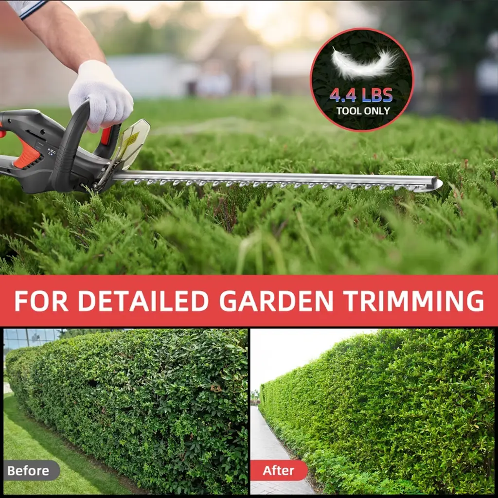 Upgrade your garden tools with this cordless electric hedge trimmer, designed for fast, clean, and quiet trimming. Featuring a 20.5-inch dual-action carbon steel blade, this battery-powered hedge cutter easily slices through branches up to 0.6 inches thick. With a 20V 4.0Ah lithium battery, it delivers 2400r/min of powerful cutting speed—perfect for maintaining hedges, shrubs, and bushes around your yard. Lightweight (only 4.4 lbs) and easy to maneuver, this wireless hedge clipper is ideal for small to medium gardens. Whether you're shaping hedges or pruning overgrown foliage, this is the ultimate portable garden trimmer to keep your landscape looking sharp. Features Cordless Convenience – 20V battery-powered design offers freedom from cords and easy mobility. Dual-Action Blade – 20.5" carbon steel blade cuts smoothly through branches up to 0.63". Powerful Performance – 2400r/min motor speed ensures efficient trimming and fast results. Lightweight & Portable – Weighs just 4.4 lbs, perfect for extended use in small to medium gardens. Adjustable Handle – Rotates 0°, 45°, 90° for flexible trimming at multiple angles. Quick Charging Battery – 4.0Ah lithium battery fully charges in just 1.5–2 hours. Safe & User-Friendly – Includes blade guard and double-switch control for added safety. Specification: Motor type: Wireless electric trimmer Voltage: 20V 455W Charging time: 1.5-2 hours Motor speed: 2400r/min Maximum shear diameter: 16mm Tool length: 37.6in Device type: Double blade Control mode: double knife control Handle Rotation: 0°, 45°, 90° (180° total range) Package Contents: Hedge trimmer*1 Blade guard*1 Battery*1 Charger*1 Instruction manual *1
