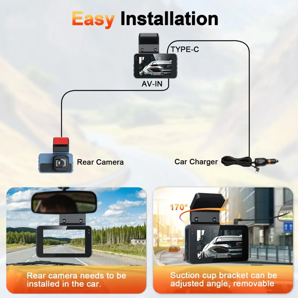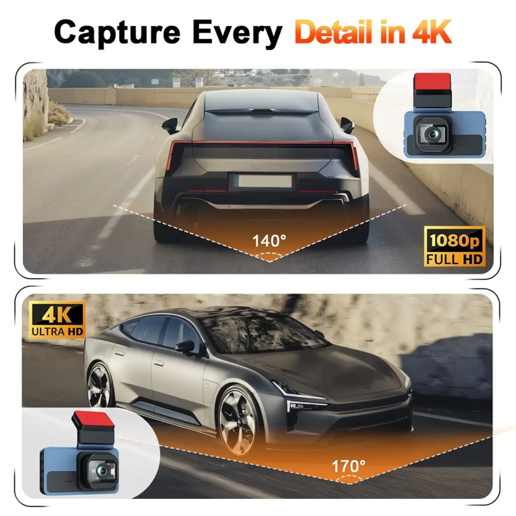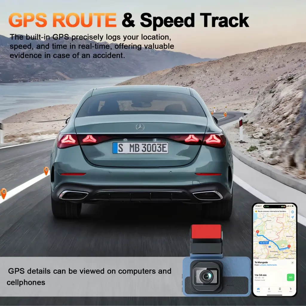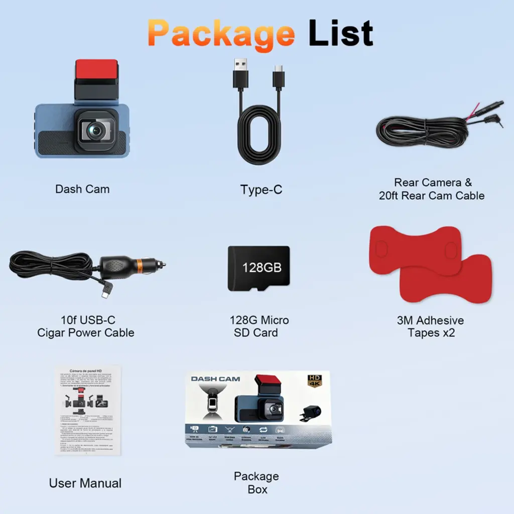 Capture every drive in stunning clarity with this upgraded 4K dash cam. Featuring dual cameras for front and rear coverage, built-in GPS for precise route and speed tracking, and WiFi for easy app control, it provides peace of mind day and night. The G-sensor locks critical footage during collisions, while 24-hour parking monitoring keeps your vehicle protected even when you’re away. Perfect for daily commuting, road trips, or rideshare drivers. Features Dual front and rear cameras with wide 170°/140° angles WiFi and app control for instant video download and sharing Loop recording overwrites oldest files for continuous capture Type-C power interface for stable, fast connection Easy installation with suction cup bracket and adjustable angle Specifications Video Resolution: Front 4K Ultra HD / Rear 1080P Full HD Viewing Angle: Front 170°, Rear 140° Connectivity: Built-in GPS, WiFi, Type-C Storage: 128GB Micro SD card included Power: Car charger or ACC hardwire kit (for parking mode) Functions: Loop recording, G-sensor emergency lock, 24-hour parking monitor, night vision Package Includes: Dash cam, rear camera with 20ft cable, 128GB Micro SD card, 10ft USB-C power cable, Type-C cable, adhesive tapes, user manual