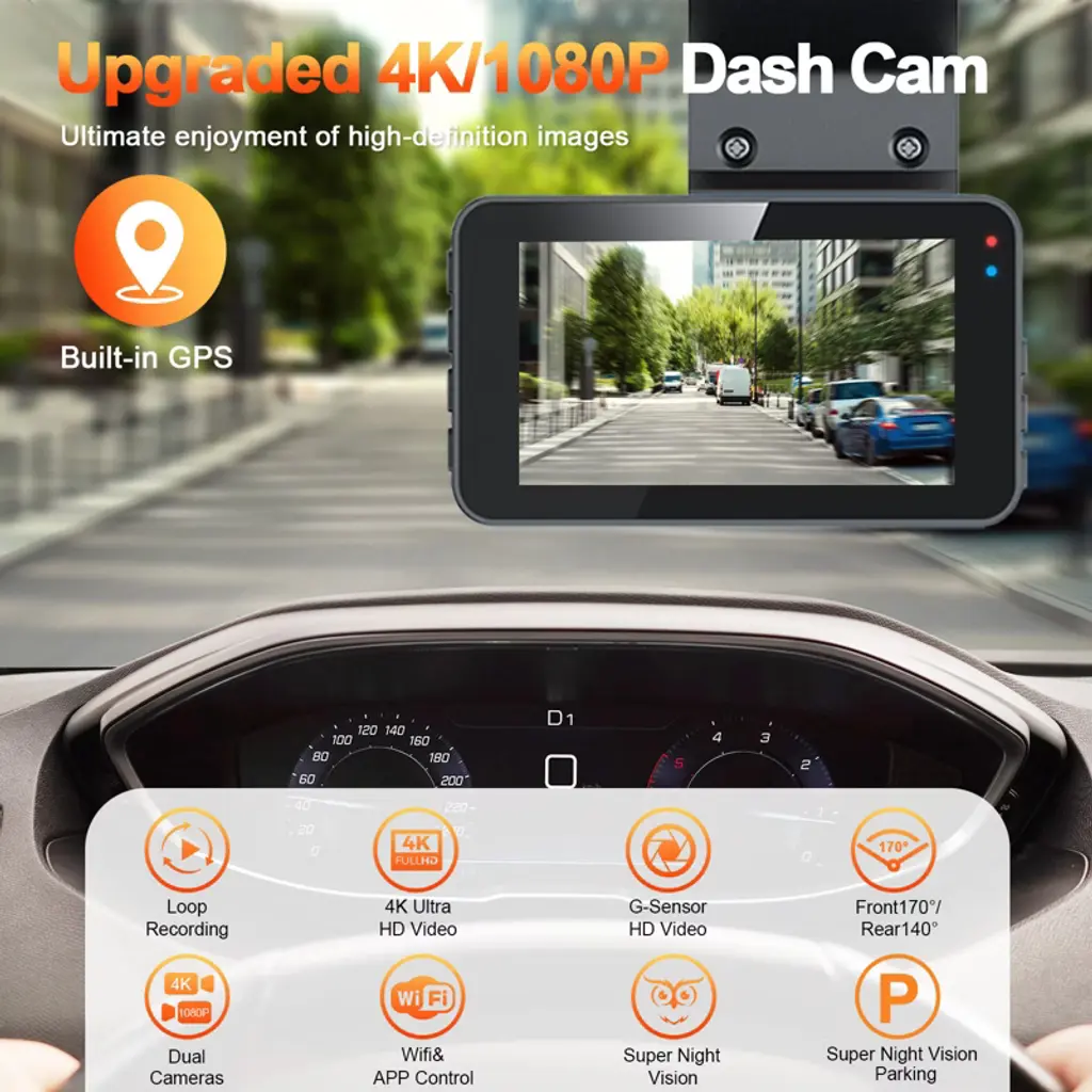 Sugift 4K Dual Dash Cam With Gps Wifi 170° Front 140° Rear Night Vision Loop Recording G-sensor Parking Monitor 128gb Card Included