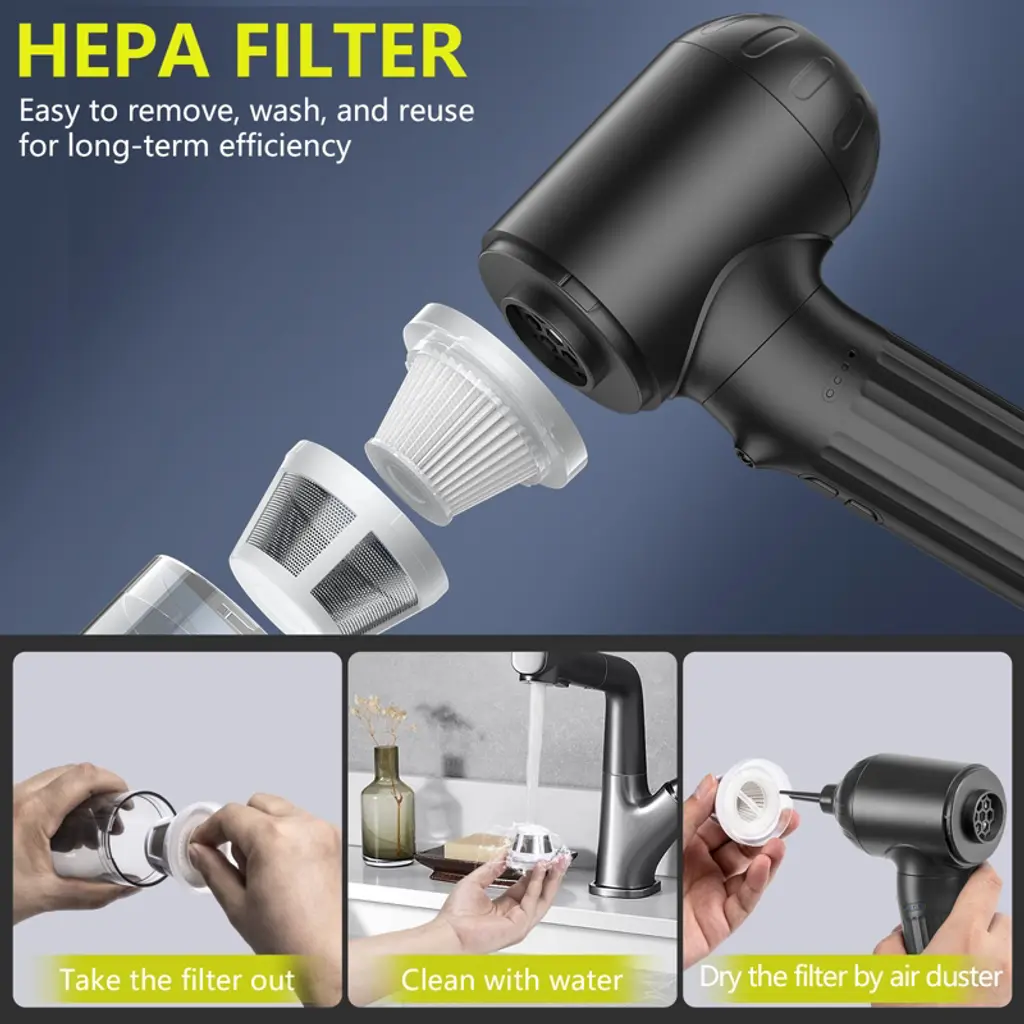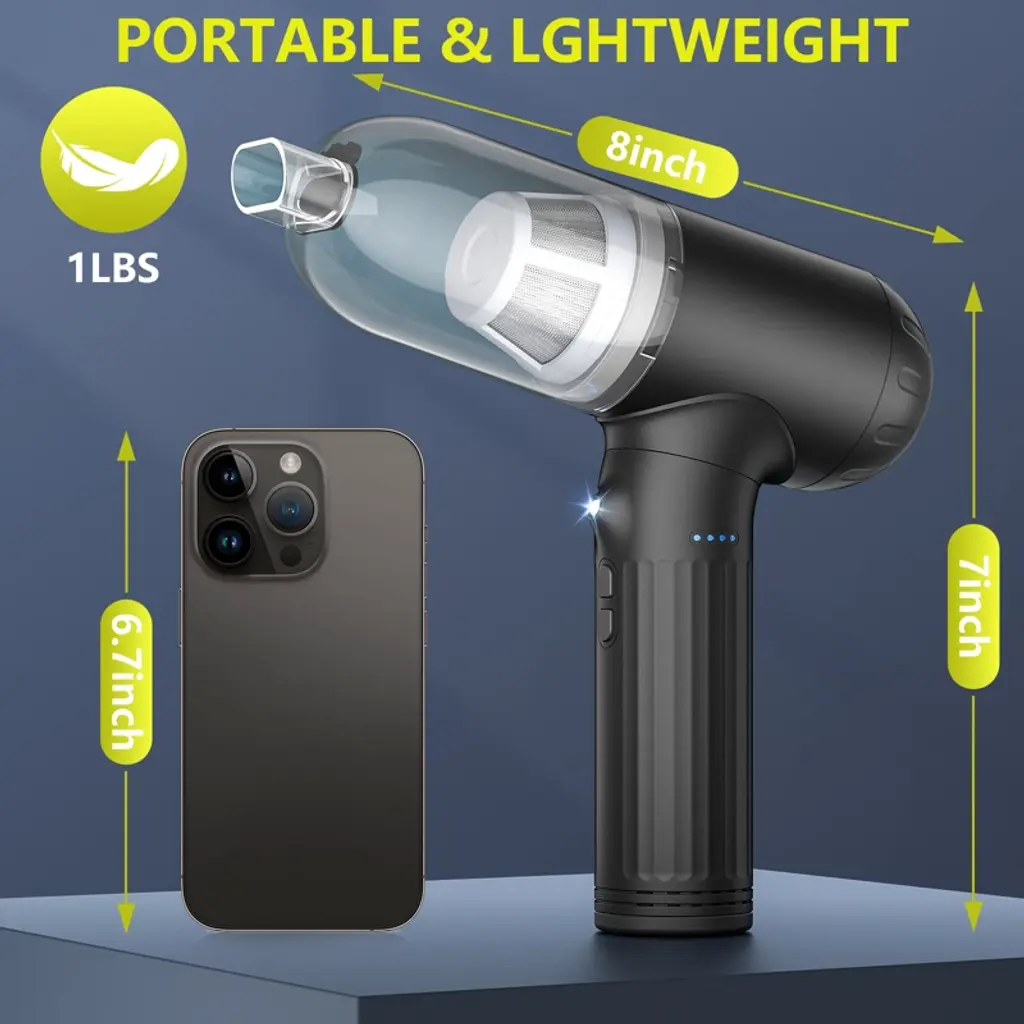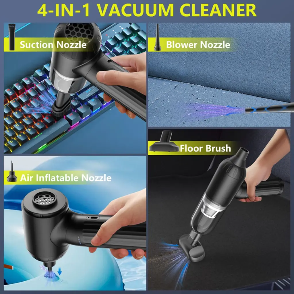 Meet the ultimate cleaning companion – a cordless 4-in-1 device that vacuums, blows, inflates, and brushes with ease. Powered by a blazing 80000RPM motor and up to 17000Pa suction, it tackles dirt in your car, home, office, or outdoor gear. Lightweight, portable, and equipped with a washable HEPA filter for effortless maintenance. Features Cordless design for unrestricted movement. Multiple nozzles for tight spots, fabrics, and delicate surfaces. Lightweight 1lb build – easy to carry and store. Perfect for car interiors, keyboards, sofas, and camping gear. Strong airflow for both suction and blowing tasks. Specifications Motor: 80000RPM Suction: 10000 / 13000 / 17000Pa Battery: 6000mAh Charge Time: 2.5h Runtime: up to 30min Weight: 1lb Size: 8 × 7in