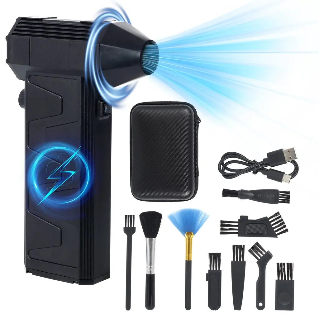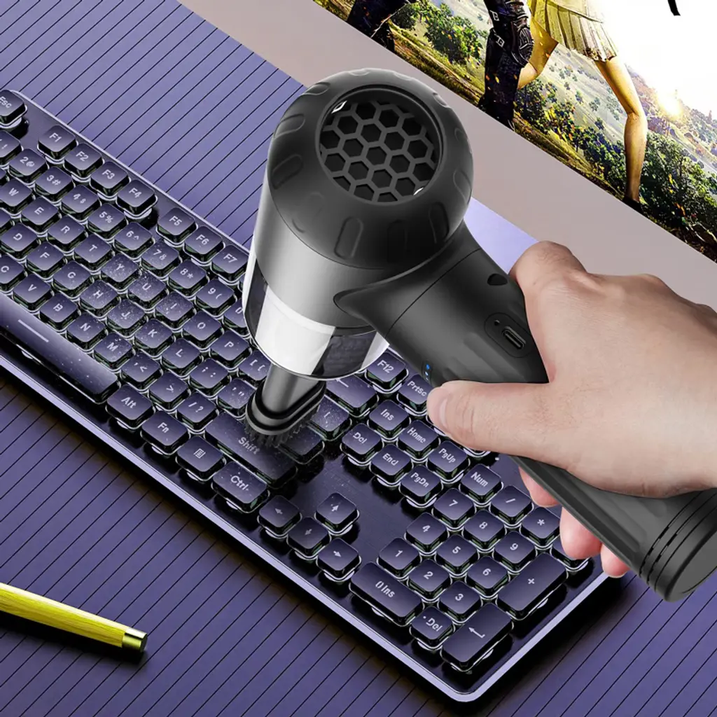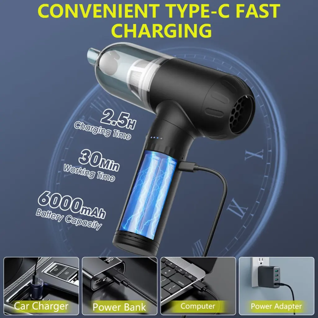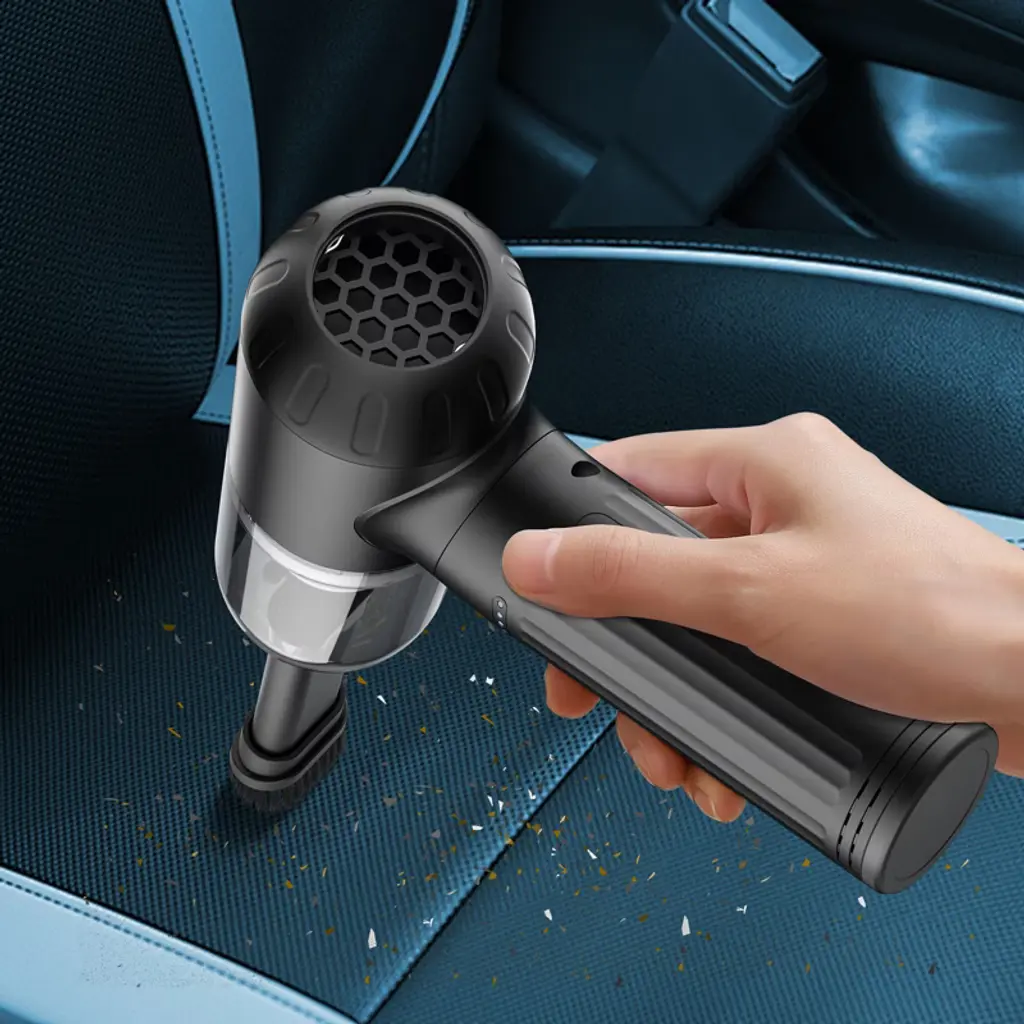 Meet the ultimate cleaning companion – a cordless 4-in-1 device that vacuums, blows, inflates, and brushes with ease. Powered by a blazing 80000RPM motor and up to 17000Pa suction, it tackles dirt in your car, home, office, or outdoor gear. Lightweight, portable, and equipped with a washable HEPA filter for effortless maintenance. Features Cordless design for unrestricted movement. Multiple nozzles for tight spots, fabrics, and delicate surfaces. Lightweight 1lb build – easy to carry and store. Perfect for car interiors, keyboards, sofas, and camping gear. Strong airflow for both suction and blowing tasks. Specifications Motor: 80000RPM Suction: 10000 / 13000 / 17000Pa Battery: 6000mAh Charge Time: 2.5h Runtime: up to 30min Weight: 1lb Size: 8 × 7in