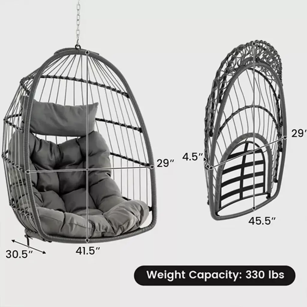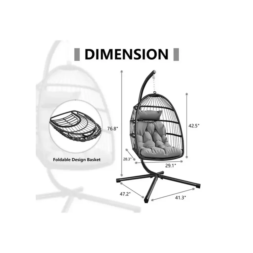Elevate your relaxation with the SUGIFT Hanging Egg Chair. Enjoy the comfort of plush, breathable cushions with an ergonomic curved design that offers full-body support. The heavy-duty steel frame, reinforced chain, and four-leg base safely support up to 350 lbs. Crafted from weather-resistant PE rattan and rust-proof steel, this chair is perfect for both indoor and outdoor use. It’s quick to set up and folds away easily for compact storage. Plus, the removable, washable cushion cover makes cleaning a breeze. Features Sink into plush, breathable cushions for lasting comfort. Ergonomic curved design for full-body support. Built with heavy-duty steel and reinforced alloy chains, supporting up to 350 lbs. A reinforced spring and four-leg base ensure superior stability. Collapsible basket allows for quick setup and space-saving folding. Weather-resistant PE rattan and rust-proof steel are suitable for any setting. Specifications Color: Black and Gray Material: Metal, Polyester, PP, PE Rattan Overall Dimensions: 47.2" x 41.3" x 76.8" (L x W x H) Weight Capacity: 350 lbs Package Includes: 1 x Swing Egg Chair 1 x Seat Cushion 1 x Headrest Pillow 1 x Instruction Manual