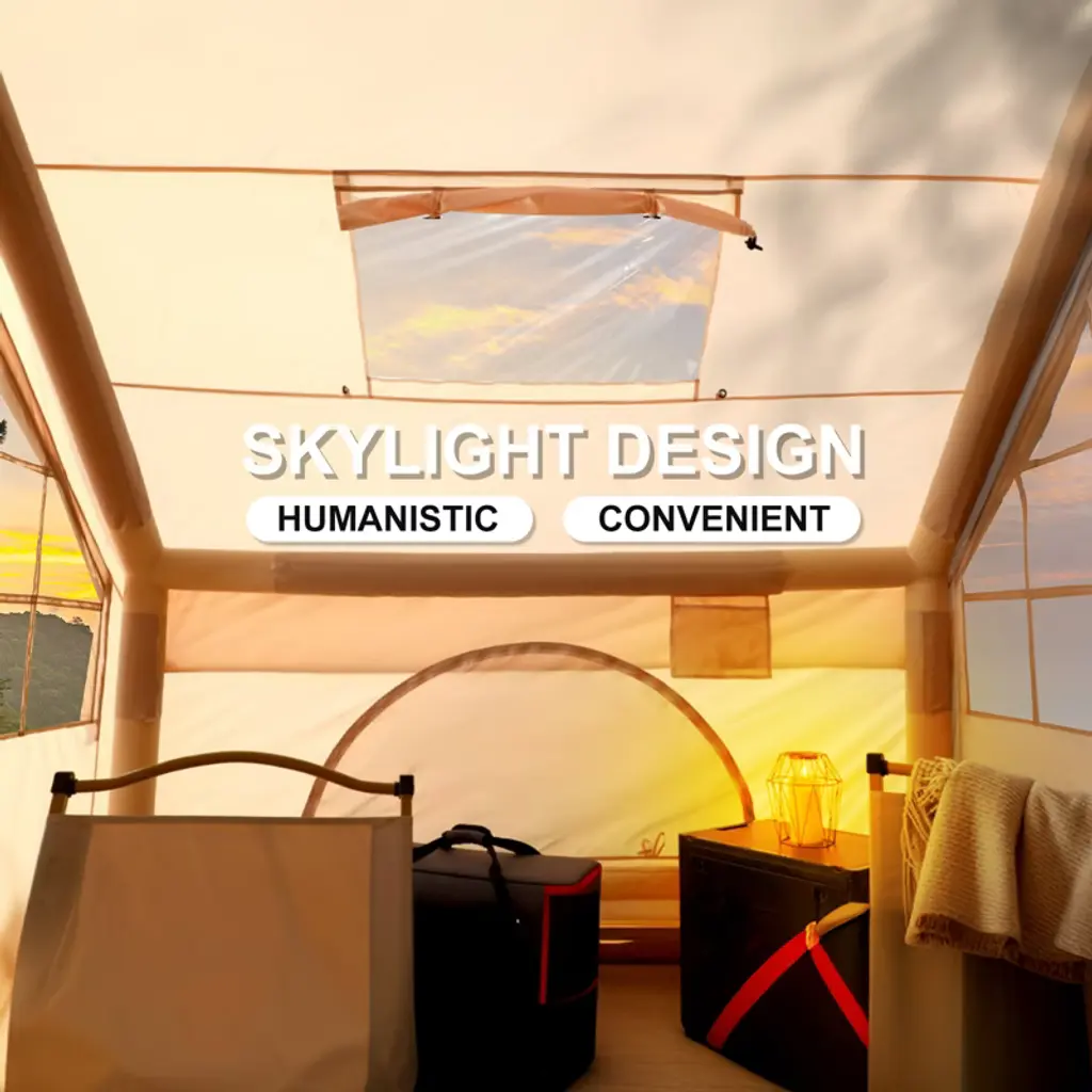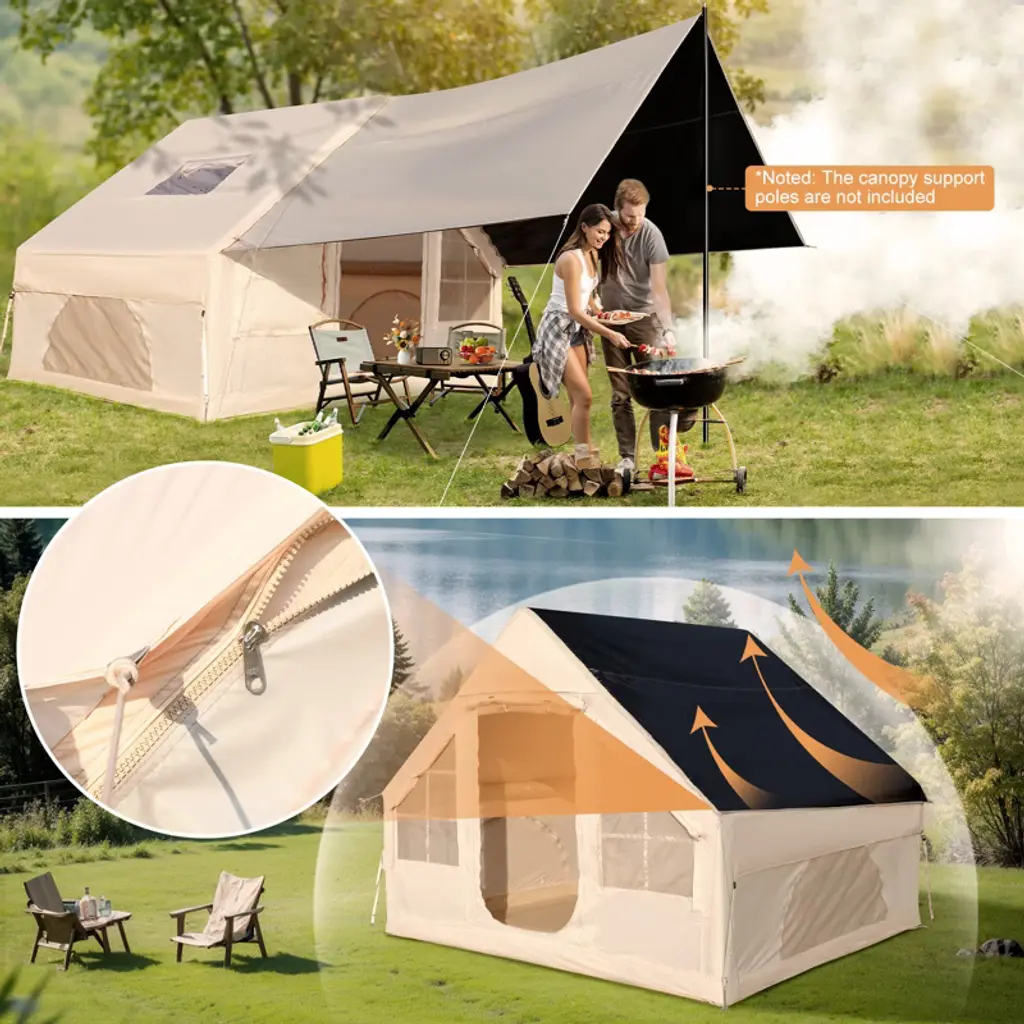 Make every outdoor adventure easier and more memorable with our Inflatable Camping Tent! Designed for fast setup and maximum comfort, this roomy tent (3m x 2.4m x 2.2m) is perfect for family camping trips, beach days, backyard sleepovers, or extra guest space. Forget the hassle of poles and ropes — simply inflate and start relaxing in minutes. Our camping tent comes with a sun - blocking awning, which helps keep you cool. Whether you're relaxing inside or enjoying the outdoors under the awning, it provides excellent sun's harsh rays experience.The skylight brings natural light inside and lets you stargaze at night. Enjoy excellent airflow through top vents and screened side windows with double-layer mesh, keeping your tent cool and your view clear. Crafted from durable Oxford fabric, this inflatable tent stands up to rugged use and changing weather. Whether you're camping, hosting friends, or hitting the beach, this tent delivers lasting comfort, easy setup, and unforgettable experiences. Features: Fast inflatable setup — no poles or complicated steps needed Spacious 3m x 2.4m x 2.2m interior, perfect for family camping Awning for extra sun protection and outdoor comfort Skylight window for natural lighting and nighttime stargazing Top vents and mesh windows for excellent airflow and clear outdoor views Durable Oxford fabric construction for long-lasting outdoor use Great for camping trips, backyard sleepovers, beach days, and guest stays Specifications Dimensions: 3m (L) x 2.4m(W) x 2.2m (H) Weight: 15 lbs Material: High-quality Oxford fabric Color: Beige Setup Method: Inflatable (pump included) Skylight: Yes Awning: Yes Doors: 2 main entrance Windows: 4 side windows with mesh layers Capacity: 6 Suitable Use: Camping, backyard, beach trips, guest room Packing List 1 x Inflatable Camping Tent 1 x Sun-Shielding Awning 1 x Repair Patch Kit 1 x Storage Carry Bag 6 x Wind Ropes 1 x Air Pump