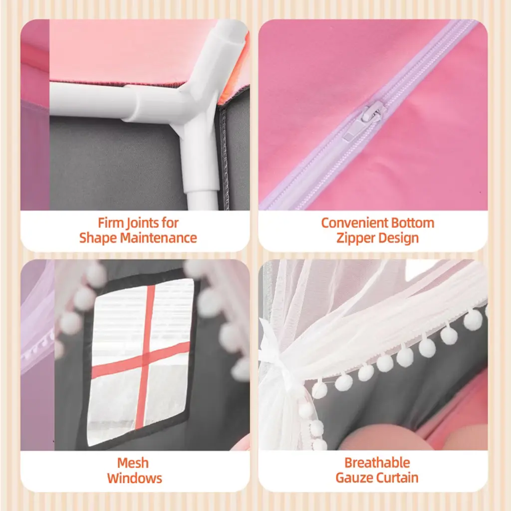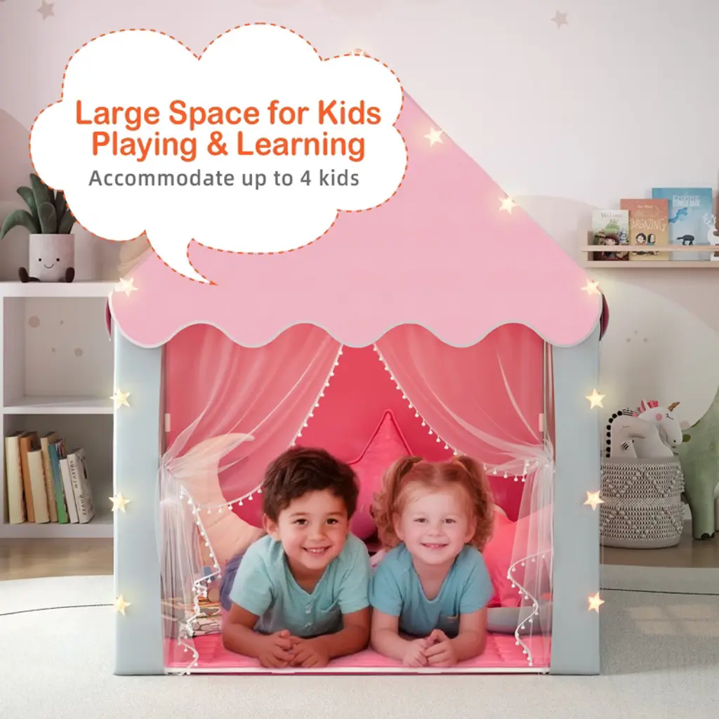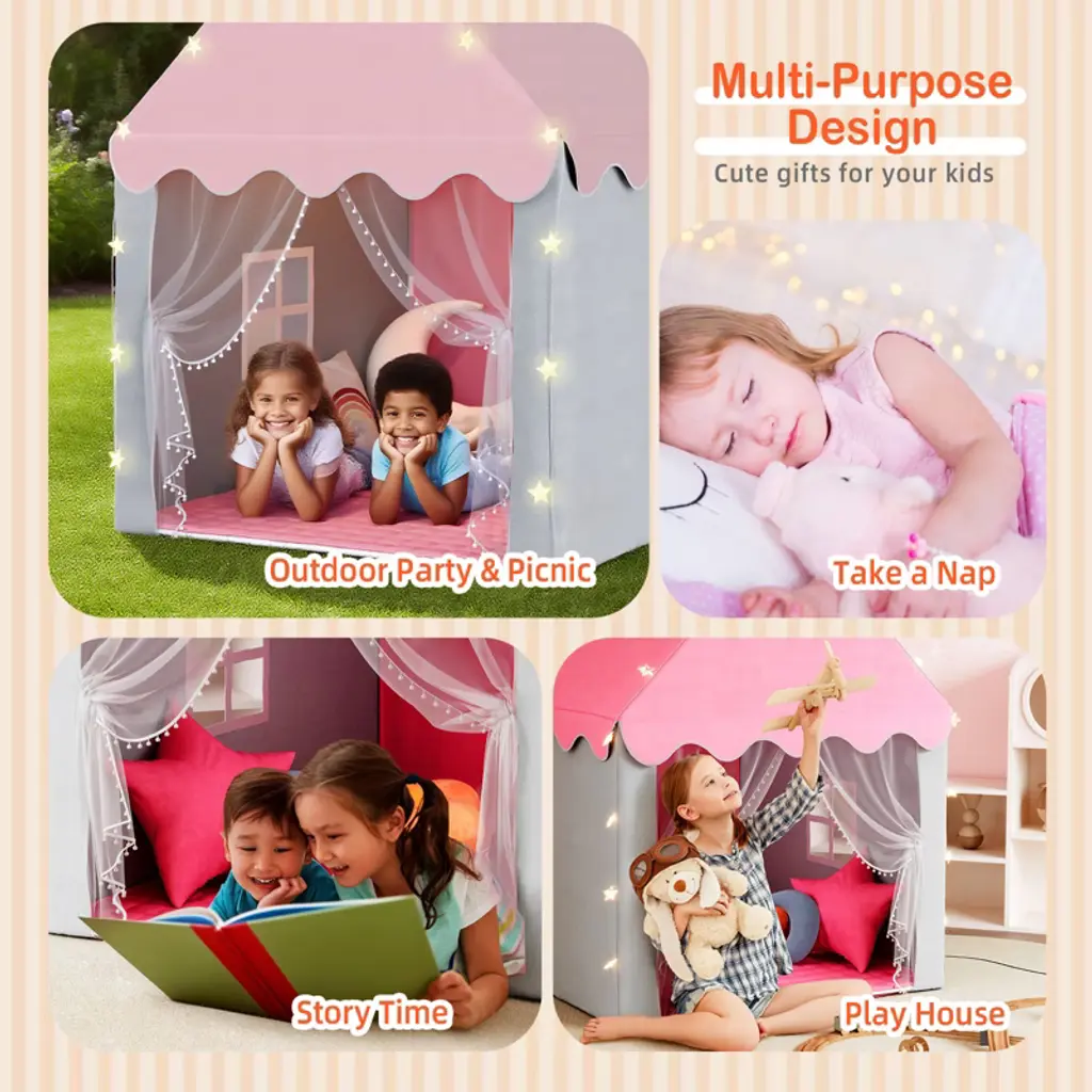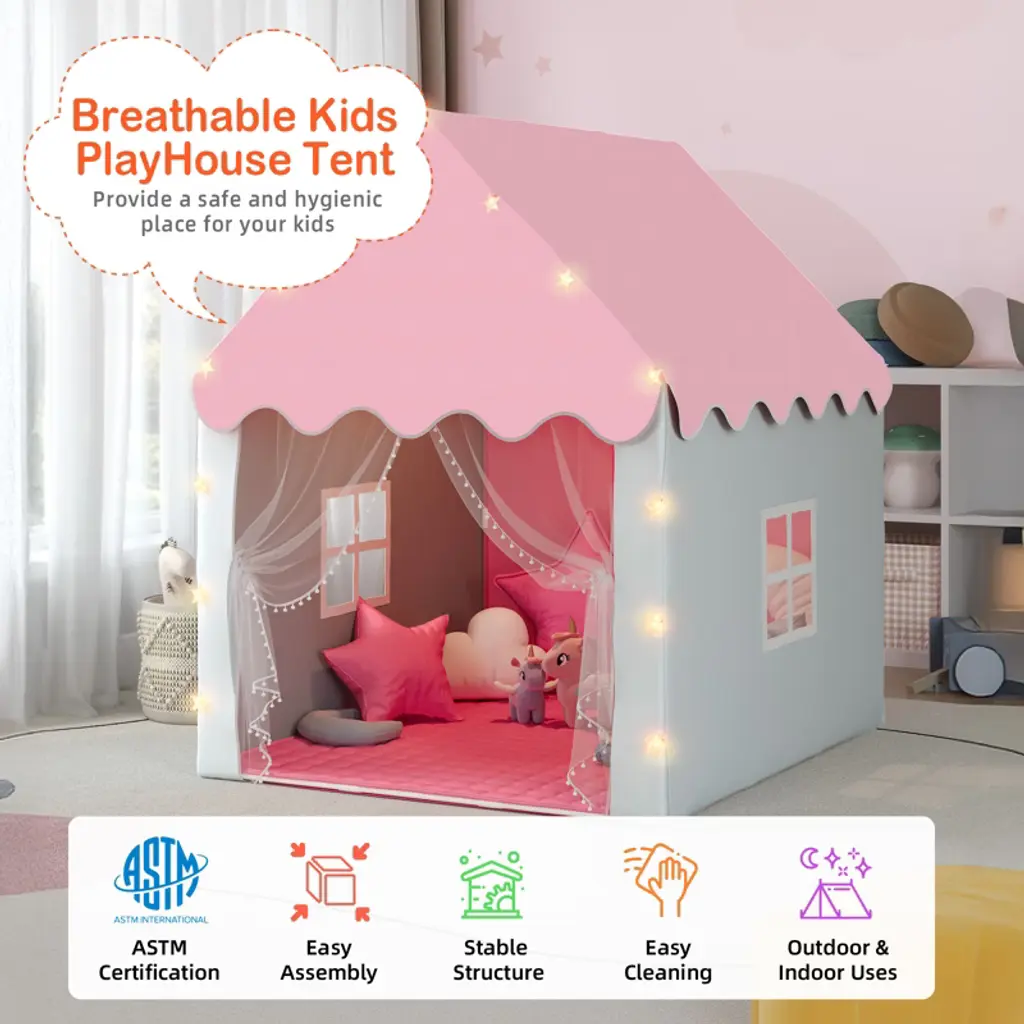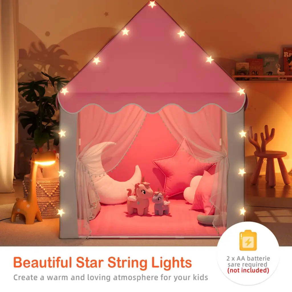 Create a magical play space for your kids with this large indoor and outdoor play tent. Designed with breathable fabric, sturdy PVC poles, and a thick cotton mat, it offers a safe, comfortable, and fun environment for children to read, nap, and play. With star string lights and mesh windows, this playhouse brings both coziness and imagination to life. Perfect for playdates, story time, parties, or quiet relaxation, it accommodates up to 4 kids for endless fun. Features Breathable gauze curtains with tie-backs for easy entry and ventilation. Mesh windows provide airflow while keeping the interior bright. ASTM certified materials ensure safety and durability. Easy assembly and disassembly with upgraded PVC poles. Convenient zipper design at the bottom for secure fitting. Specifications Dimensions: 51.2 x 47.2 x 39.4 inches Material: Breathable fabric + thick PVC poles + cotton mat Weight Capacity: Suitable for up to 4 children Lights: Star string lights (2 AA batteries required, not included) Certification: ASTM certified for child safety